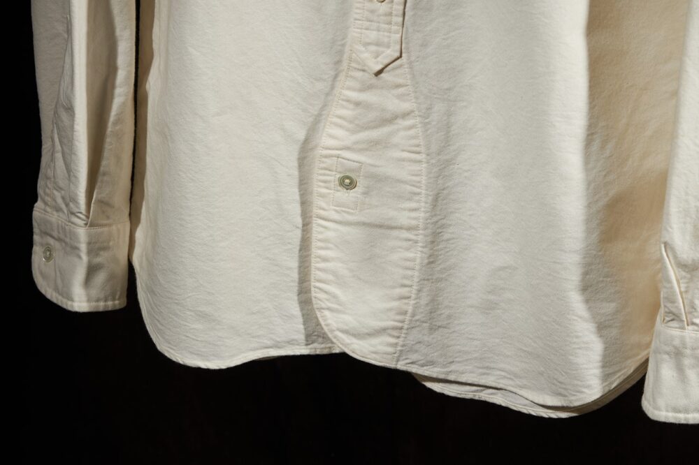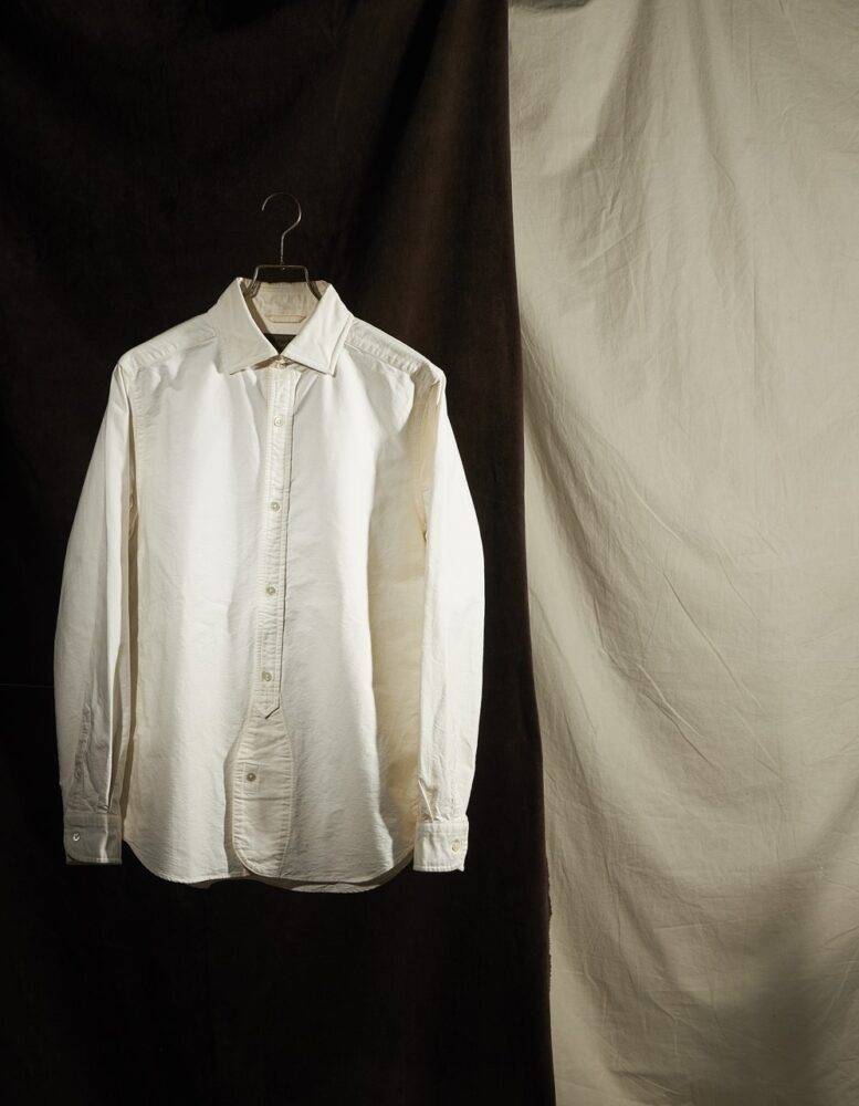 ヴィンテージフレンチワークのキャンバスパンツをもとに開発した生地を用い10年以上、定番として作られるブリティッシュ オフィサーシャツ。良質な超長綿ならではの自然な光沢、着用ごとに馴染む、しなやかながらもコシのある生地は、愛着の湧く1枚になるはず。一般的には、10~15回の洗濯試験のところ、なんと100回もの洗いにも耐えた驚異的な耐久性はこのシャツの大きな魅力。2万900円