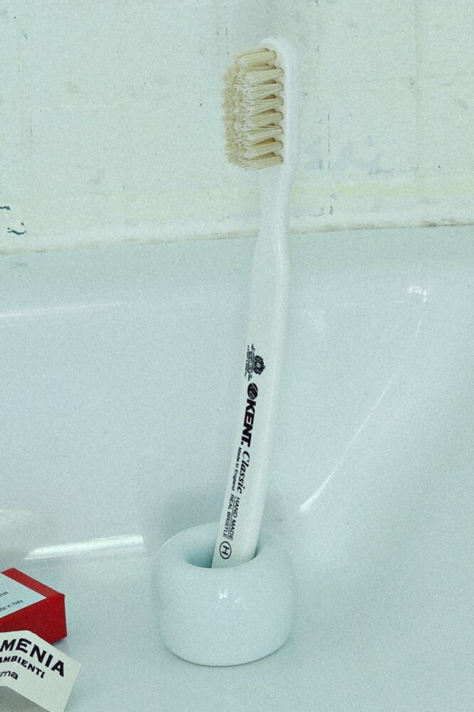 髪の毛と歯は日々のケアが物を言う。その点、英国王室御用達の証たるロイヤルワラントを受けている G.B.ケントの歯ブラシなら信頼がおける。クラシックに使用されているのはコシのある白豚毛。天然毛は歯のエナメル質に優しく、デリケートな歯茎を傷つけることなく安心だ。4180円(オックスフォードタイム 042-724-5581)