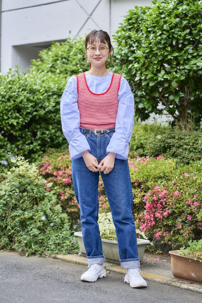 下北沢「balloonbala」に務める小松さん。インナーとブーツを赤で統一して、下北沢らしい自由かつ個性的なスタイリング。