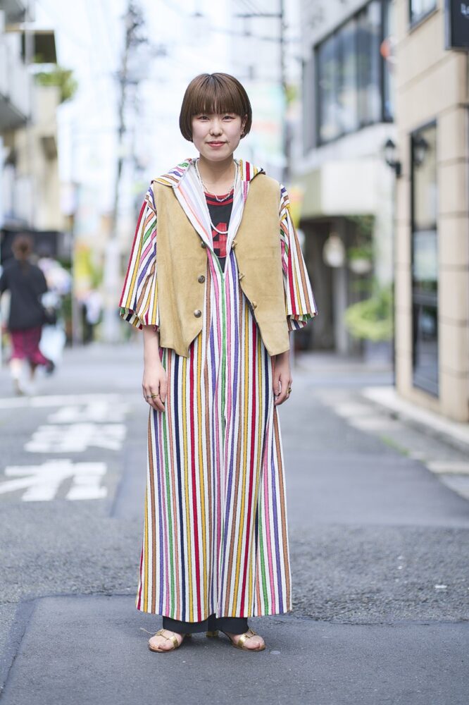 目を引く鮮やかなストライプワンピースのVネックから見えるTシャツ、カラーのまとめ役としてスウェードジャケット。まさにレイヤードマスター!