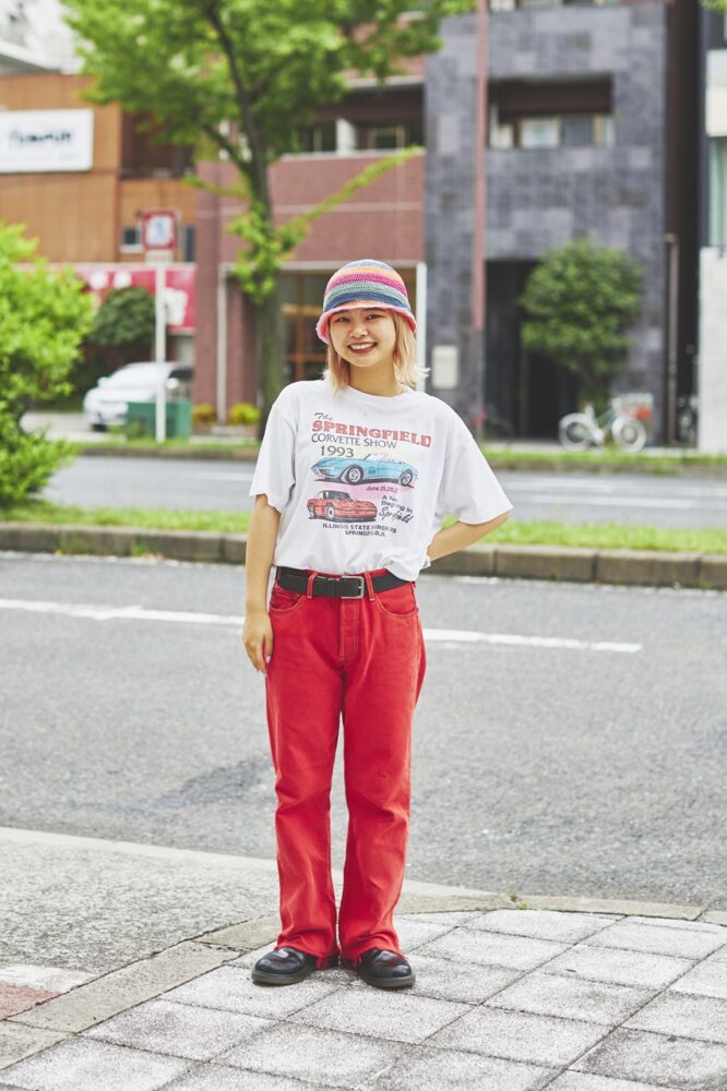 真っ赤なワイドパンツも目を引くが、主役はシボレーコルベットのプリントT。対照的な組み合わせだが、違和感がなく印象的。