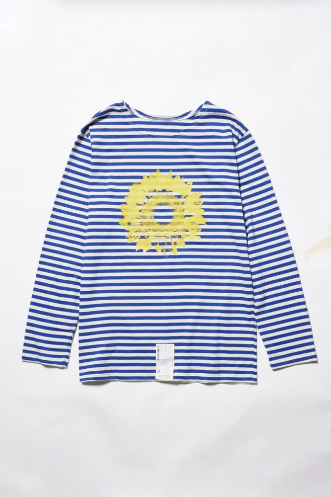 今季のスペシャル企画として、ロシア軍デッドストックのボーダーカットソー にウクライナの国花ヒマワリをプリント。収益はウクライナ支援に寄付される