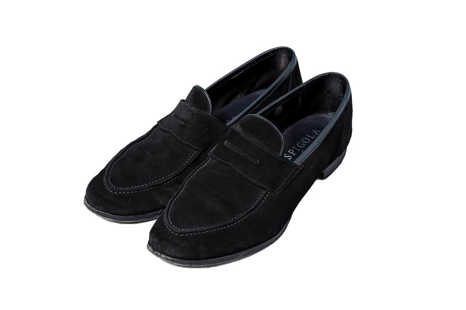 2足目はスピーゴラのスエード製ペニーローファー。今回2n dの企画ページでも紹介しているアンラインド(裏地なし)の一足です。日本人職人が手掛けるビスポークの技を生かしており、非常にハイグレード。セットアップ・スーツなどをノータイで着こなすときや、カジュアルスタイルのシーンで活躍します。