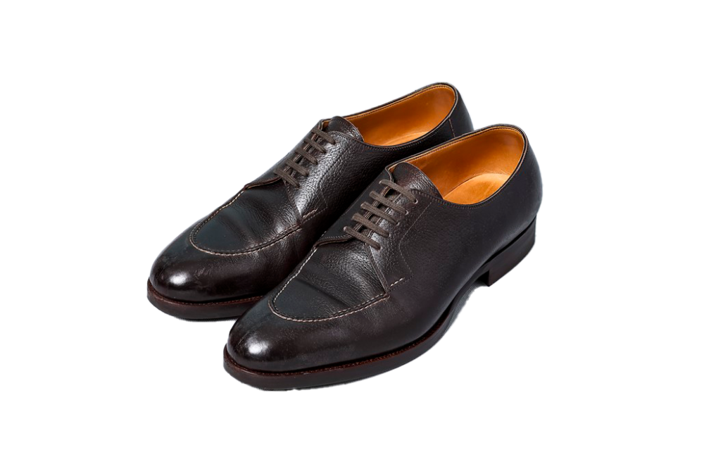 最後はオーストリア発祥のサンクリスピン。最大の魅力はビスポークシューズに極めて近いハンドソーン仕立てであるところ。ウエストの美しい絞り込みも見どころのひとつです。オイルを十分に含んだシボ革も味わい深く、ドレスシューズのシェイプでありながら、独特の力強さを兼備しています。コットンスラックスなどに合わせると、最大限にポテンシャルを発揮する素敵な一足です。