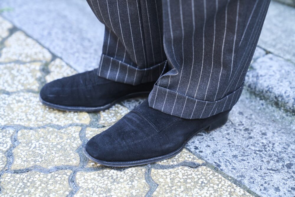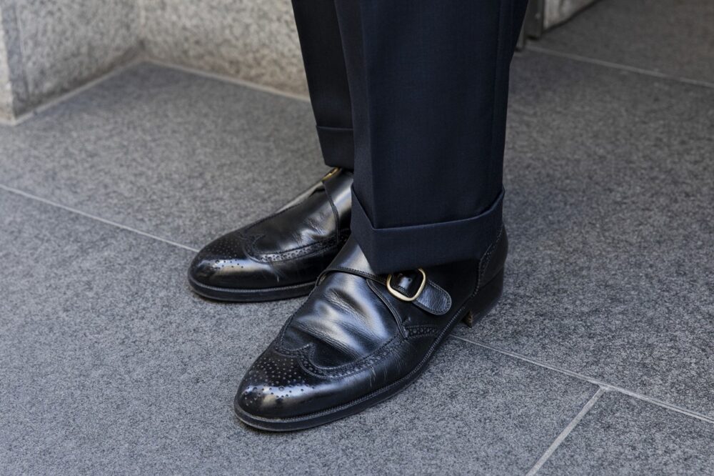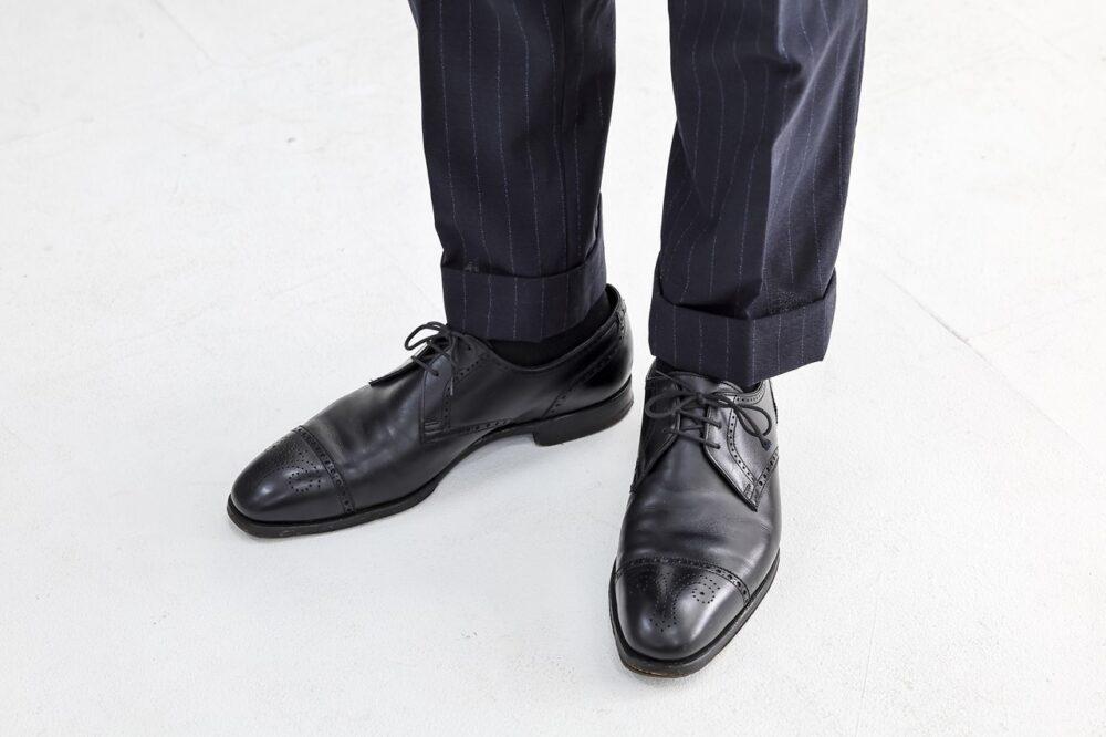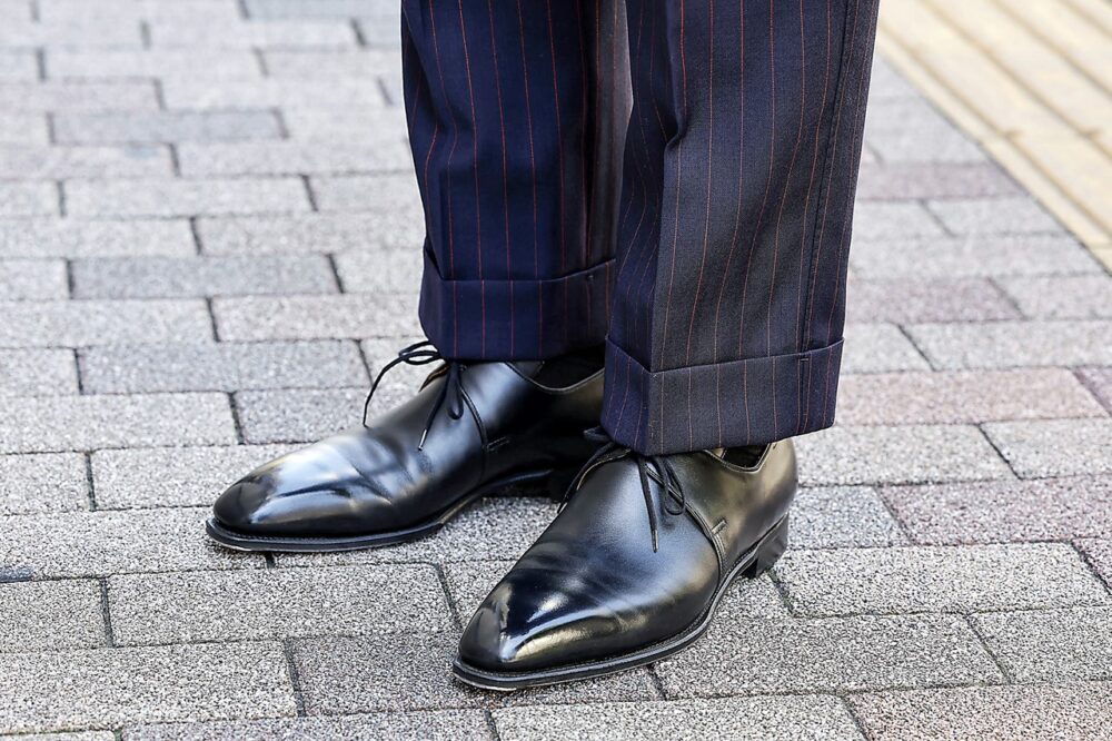 「しっかりと 重厚感がありながらも、ブラックスーツではなく、ビジネススタイルの延長にあるフォーマルスタイルに。足元もフルオーダーした英国ものです」
