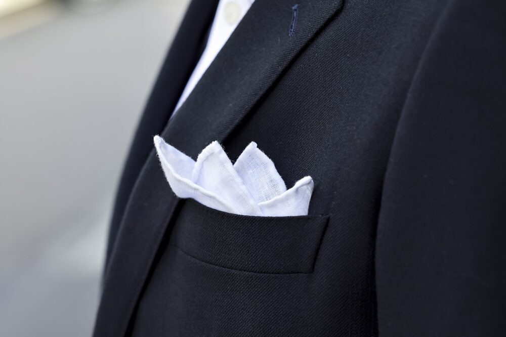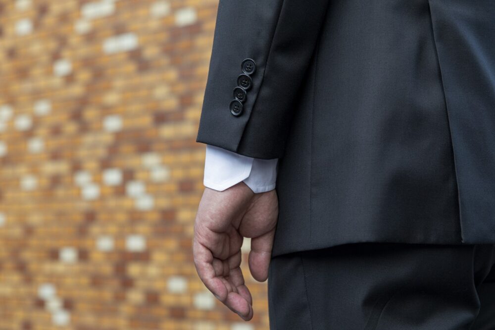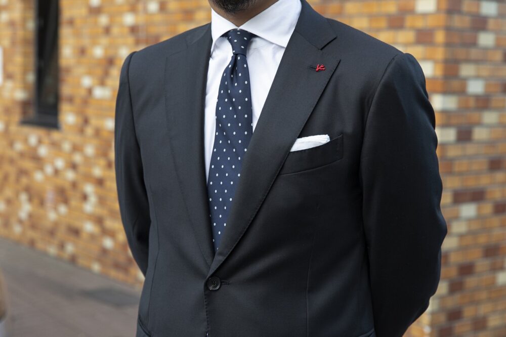 日本においてフォーマルシーンはブラックが基本だが、海外では、ネイビーはフォーマルな色。坂井さんが着用するスーツは、一見ブラックに見えて、実は濃紺のスーツ。