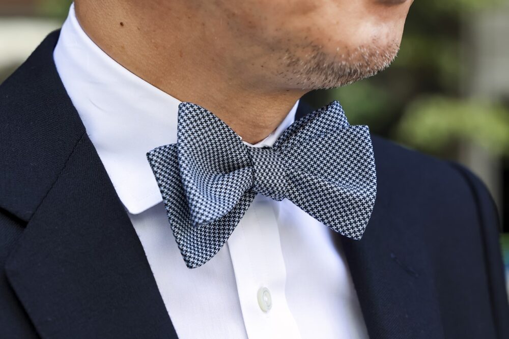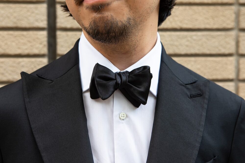 「よく見ると濃紺にグレンチェックの柄が入っています。もともとネイビー系の色が好みではあるのですが、フォーマルシーンでもネイビーは通用する色。ホワイトのシャツにボウタイでフォーマル度をさらに上げています」