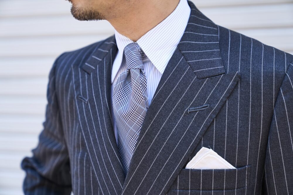 「あえて少しカジュアル感のあるリネン混のスーツを選んでいますが、ピークドラペルに2B仕様なのでフォーマルさも十分です。また素材的にサテンが合わないのでタイもビッグハンドトゥースをチョイス。タブカラーで立体感をだしています」