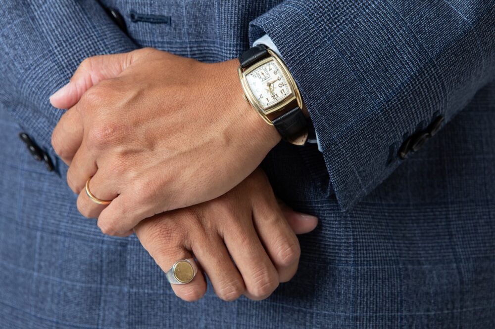 「カッチリしすぎない少しラフさを感じるスタイルをあえて選びます。もちろん失礼のない程度にですが。今回でしたらクラシカルなダブルのジャケットが重厚な分、Vゾーンは同色系でまとめすっきりと。さらにシューズや時計、リングなどの小物でバランスを取りました」