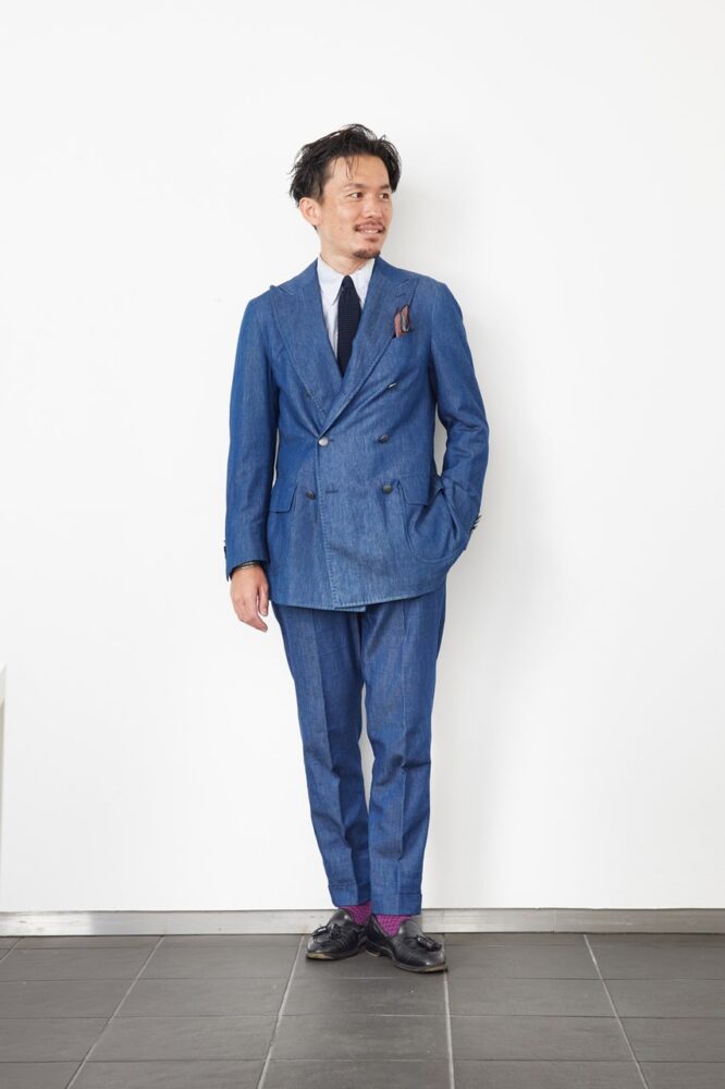 「パーティということで少し華やかな感じにしたくブルーのコットンスーツをセレクトしました」というとおり、鮮やかなシャンブレー生地を使ったセットアップが目を引く。インナーにはオックスフォードのボタンダウンを合わせカジュアルさを強めている。