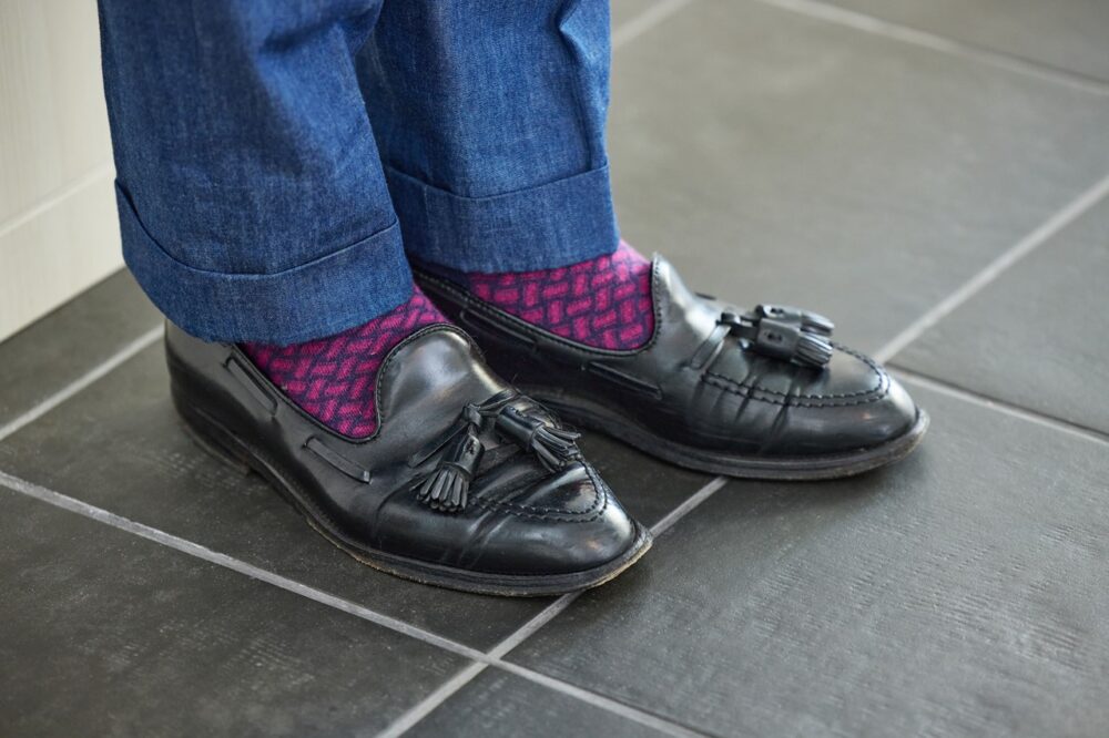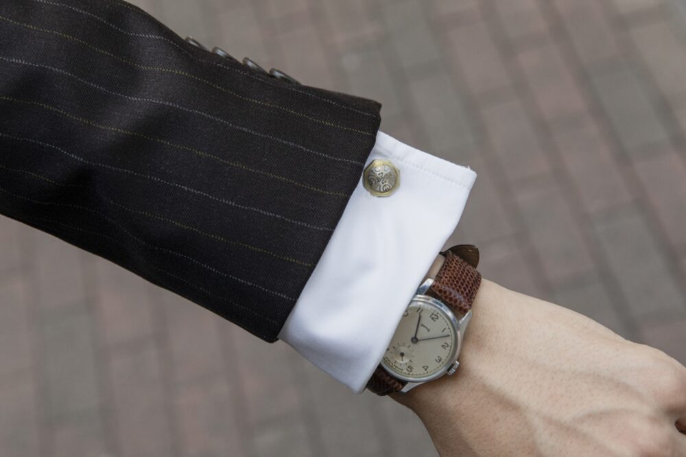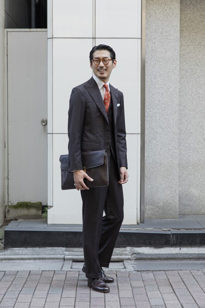 5.「フェアファクスコレクティブ」商品企画・坂井哲也さん|ジャケパンスタイルにカラーピンでフォーマル度アップ 。