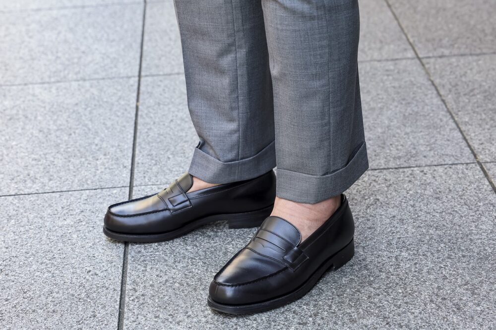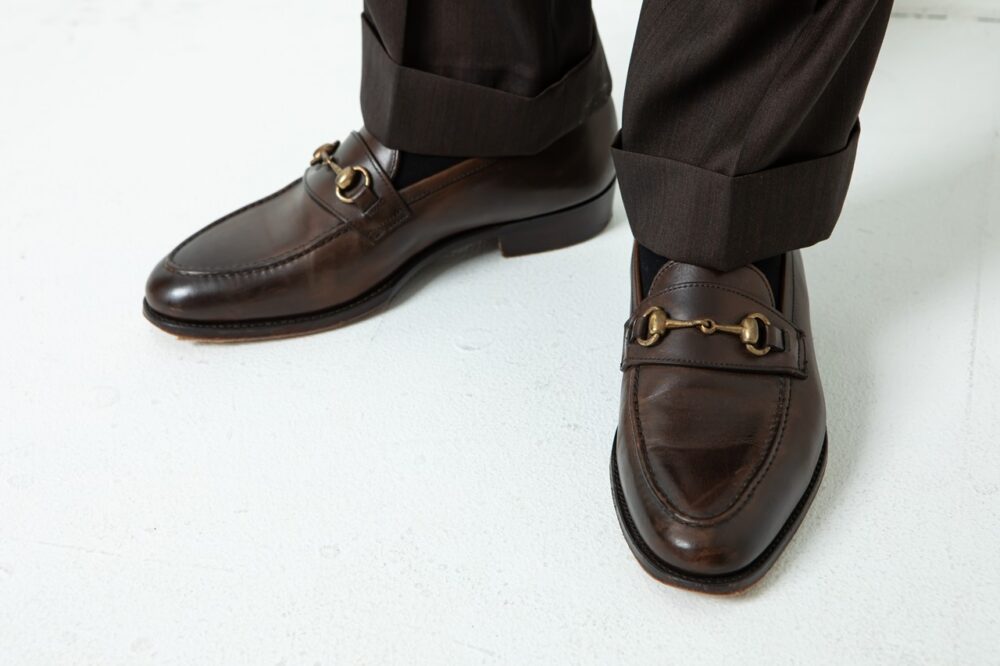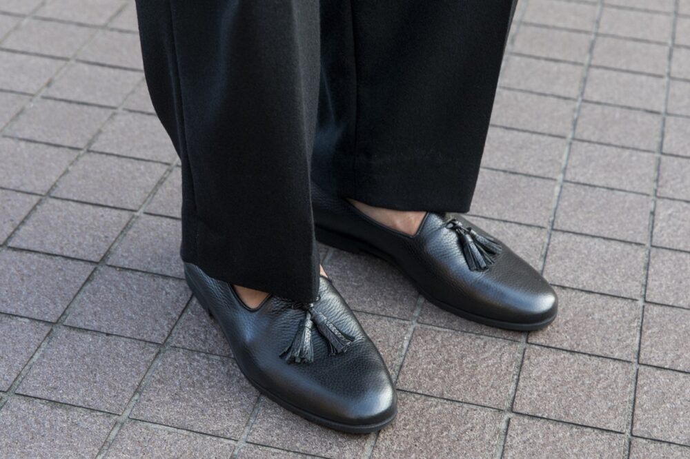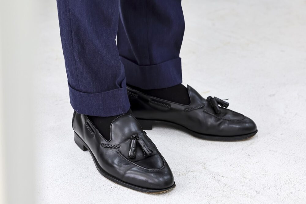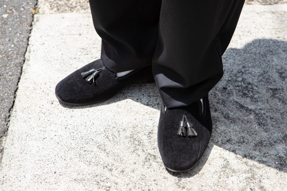 「パーティだと堅すぎる印象を持たれたくないので、随所にヌケ感を出すように意識しています。足元がローファーなので、逆にVゾーンにはキッチリ感を出しました」