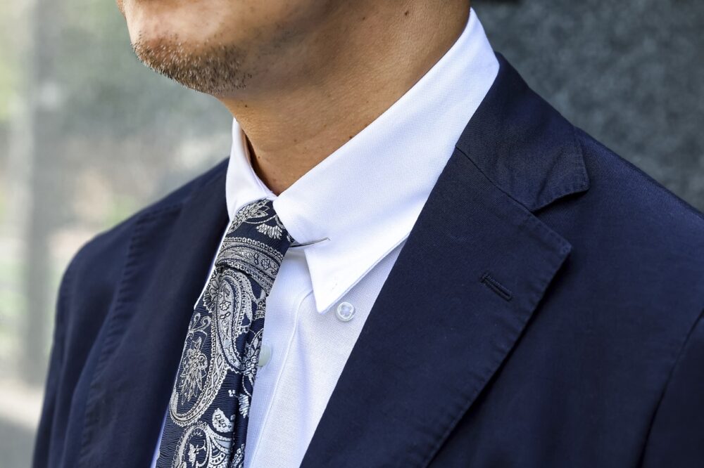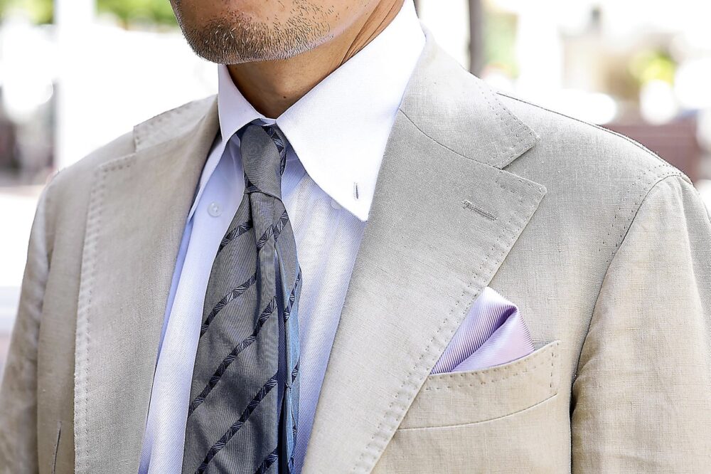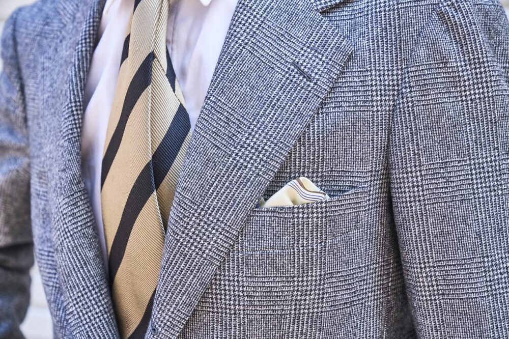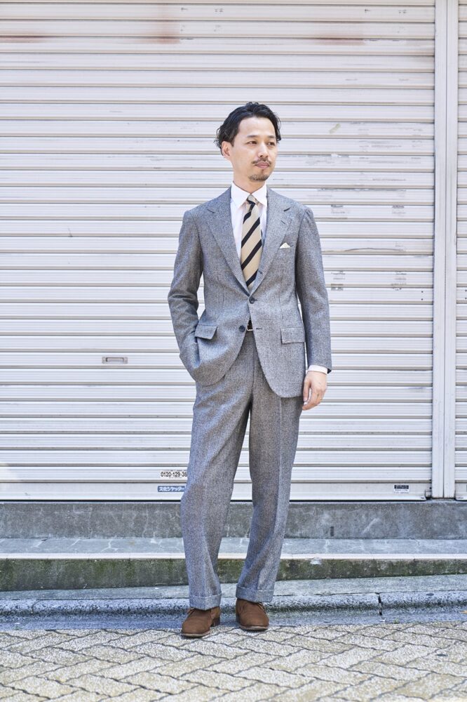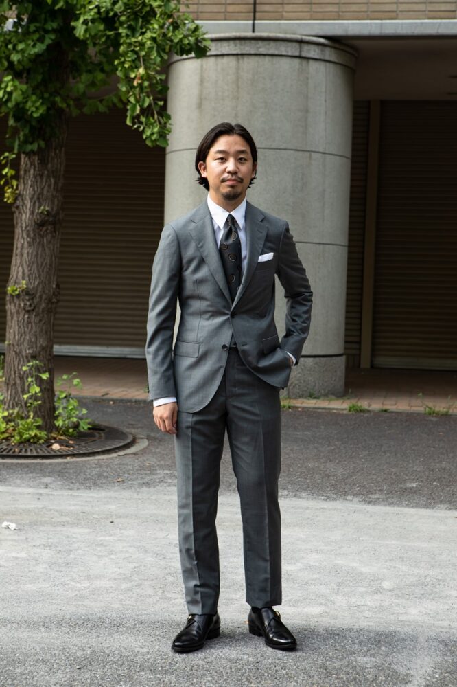 「英国調の大柄が特徴のネクタイをしっかりとタイドアップすることで、クラシカルかつトレンドを意識したスタイルにまとめました。シンプルゆえに若さが悪目立ちしそうな時は、Vゾーンから意識的に老練された雰囲気を作るようにしています」