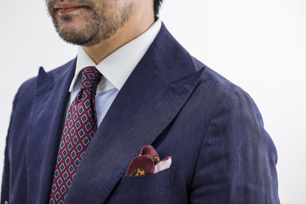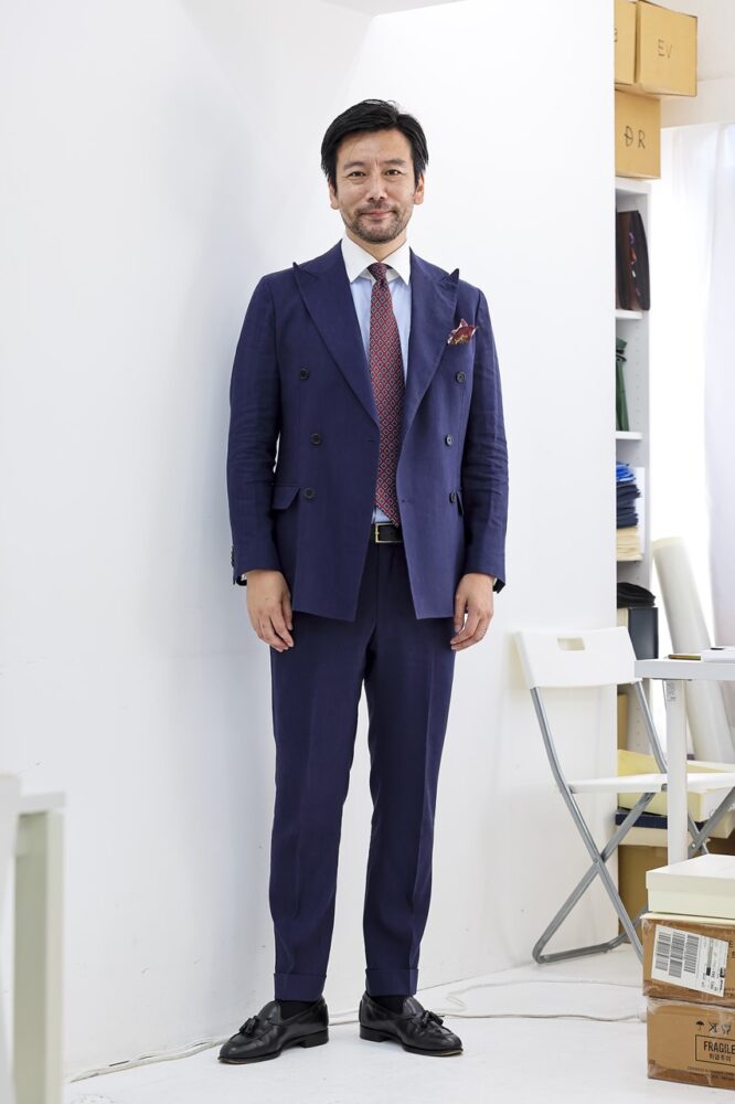 落ち着きのあるネイビースーツでありながらもダブルブレスト、ピークドラペル、そしてリネン混のスーツ生地など、パーティコーディネイトならではの個性が光るディテールが魅力。