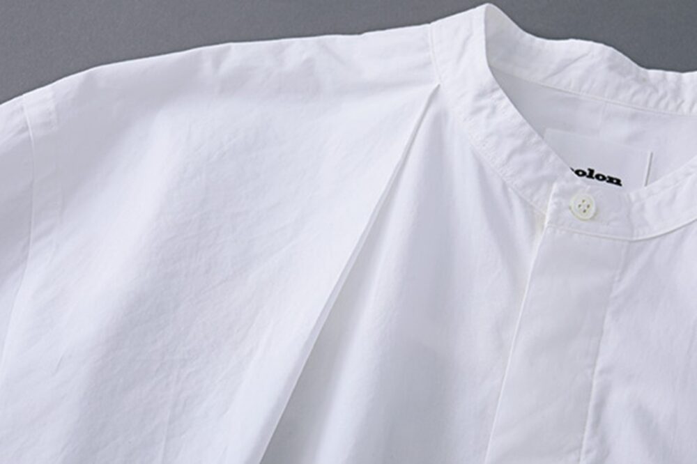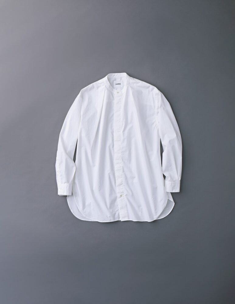 襟元の深いインプリーツは着るだけで美しいシルエットを演出する、革新的なオリジナルデザイン。細番手の糸を高密度で打ち込んだコットンタイプライター生地を使用した1枚はすでに定番人気を誇る。2万6400円