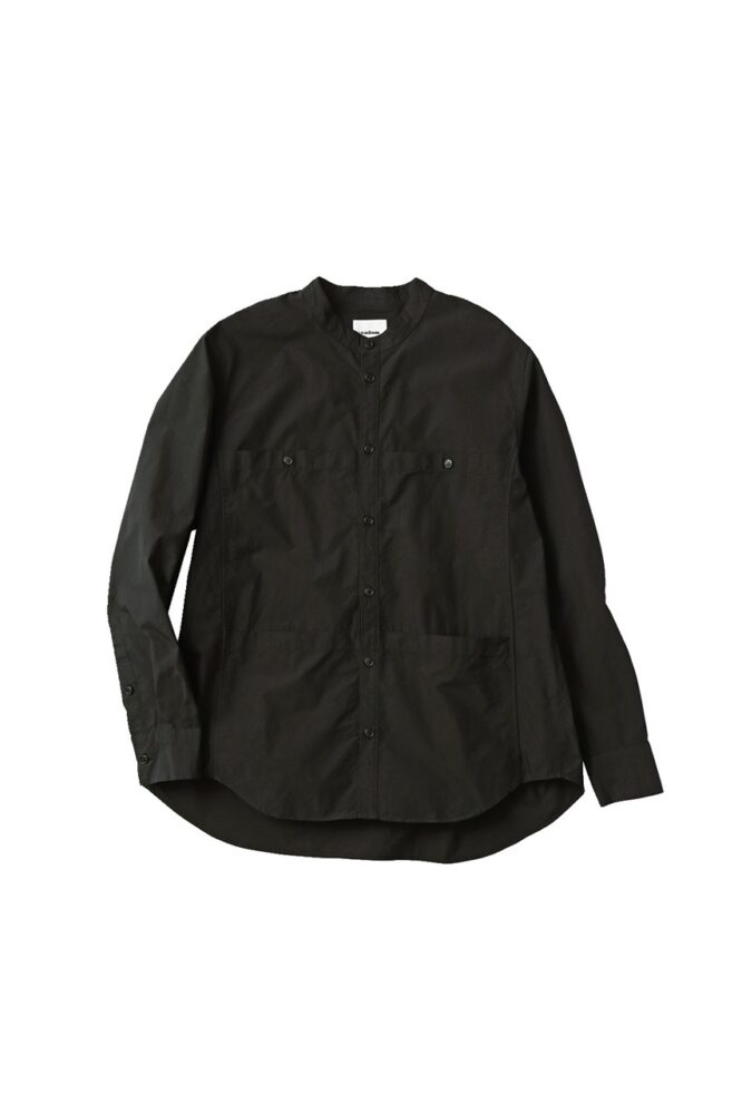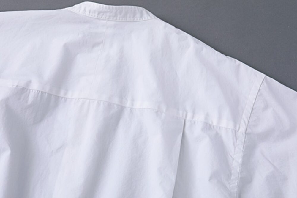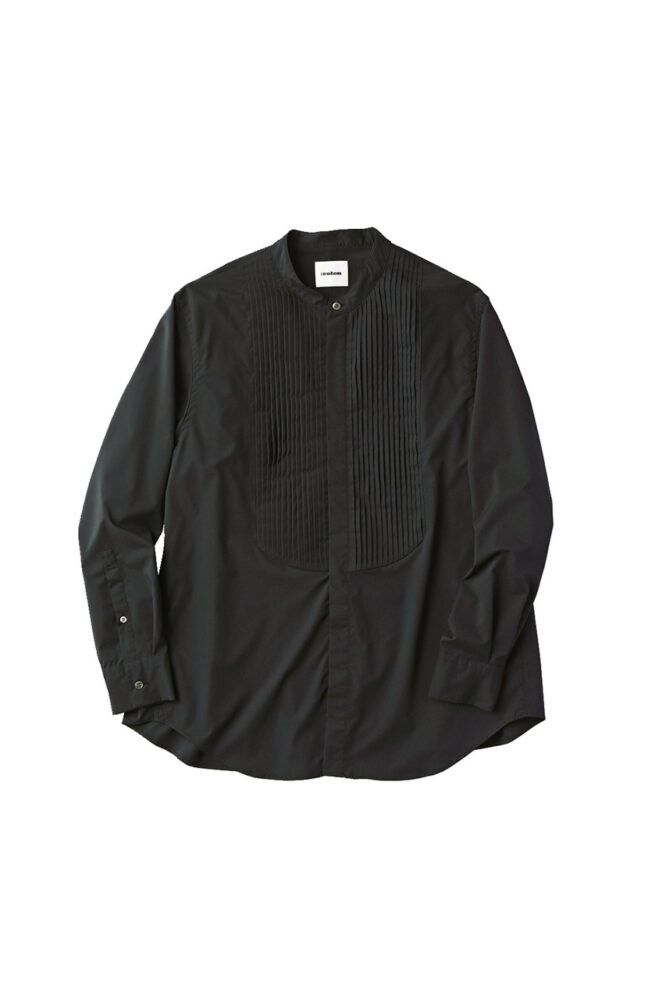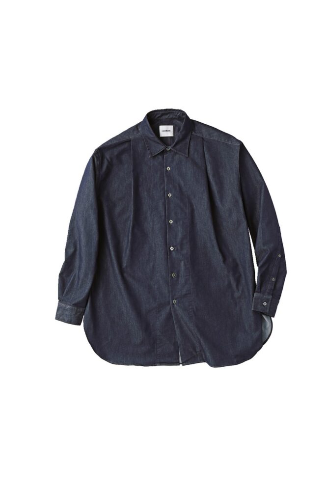 ゆとりのあるシルエットは、計算されたパターンや巧みなプリーツ使いでドレスシャツのような美しさを演出する。カジュアルにタックアウトして着用することを想定した大人のためのシャツ。