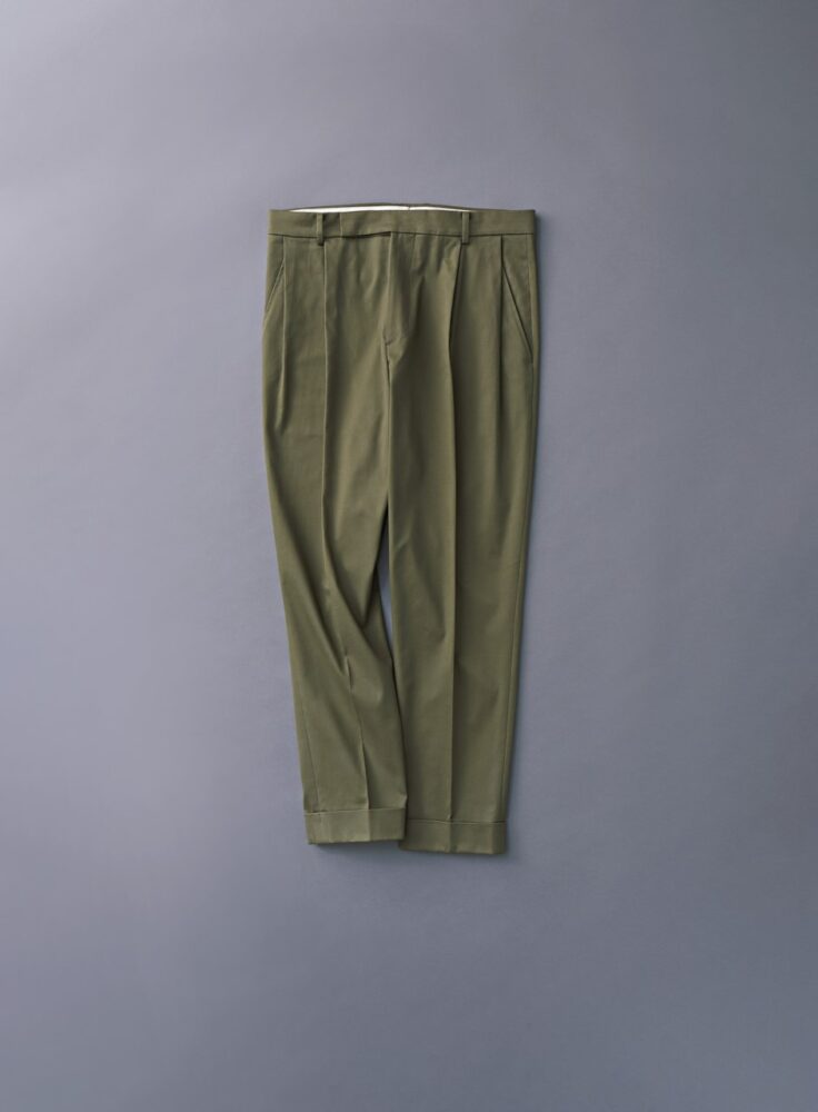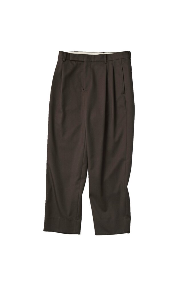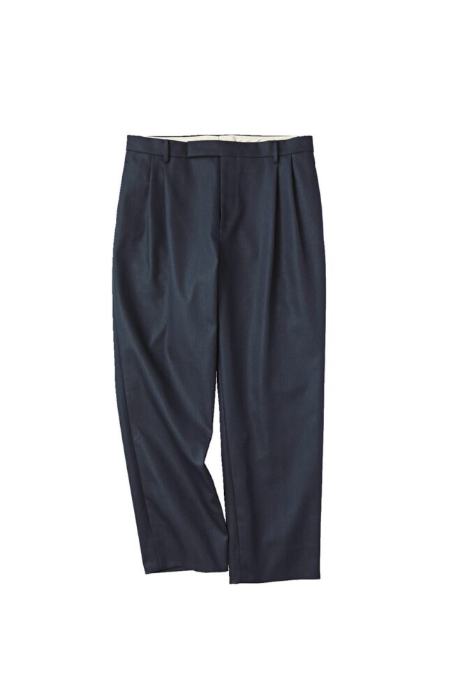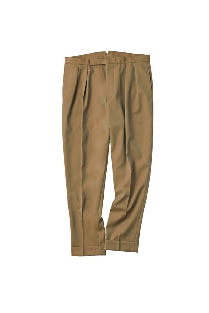 2プリーツのゆとりあるワタリから、裾にかけて綺麗にテーパードする定番シルエット。メゾンでも使用される高級ウールギャバジンを使用した贅沢な仕様は秋冬ワードローブの主力筆頭。3万9600円