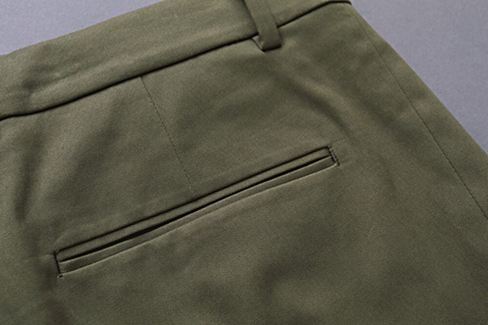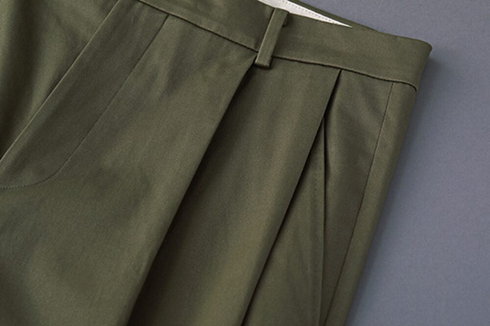 アウトプリーツとスラントポケットが重なる独自デザイン。ポケット口は手縫い風ステッチを施したビスポークのような雰囲気。