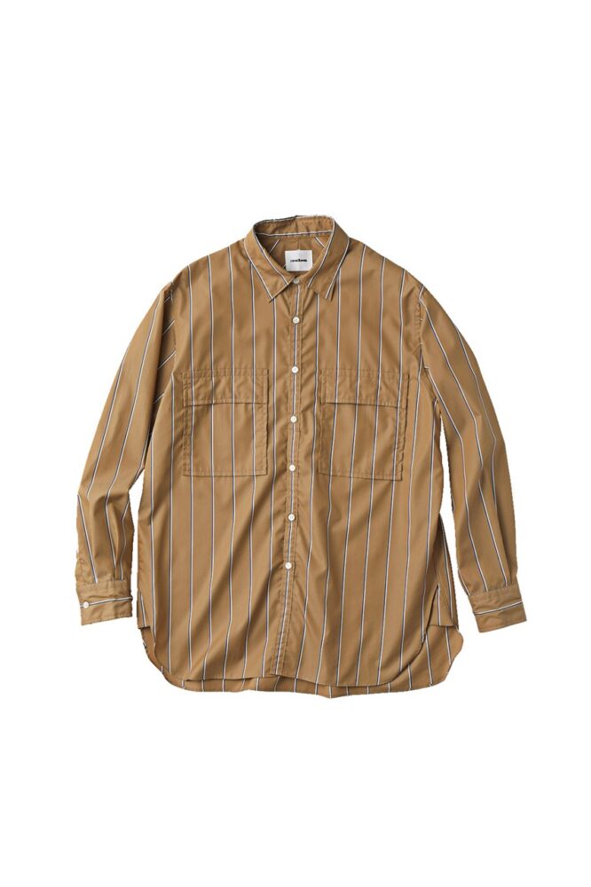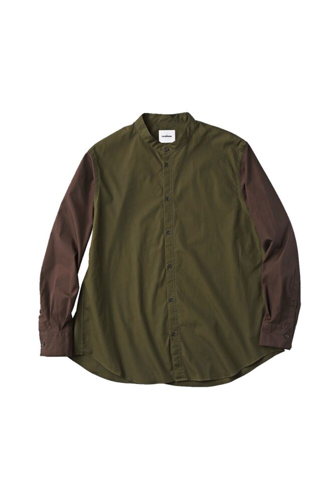 プリーツなどのデザインを排した、シンプルなスタンドカラーシャツ。生地は高密度コットンブロード。カーキ×ブラウンの落ち着いたツートーン配色に、大人の遊び心を覗かせる。2万4000円