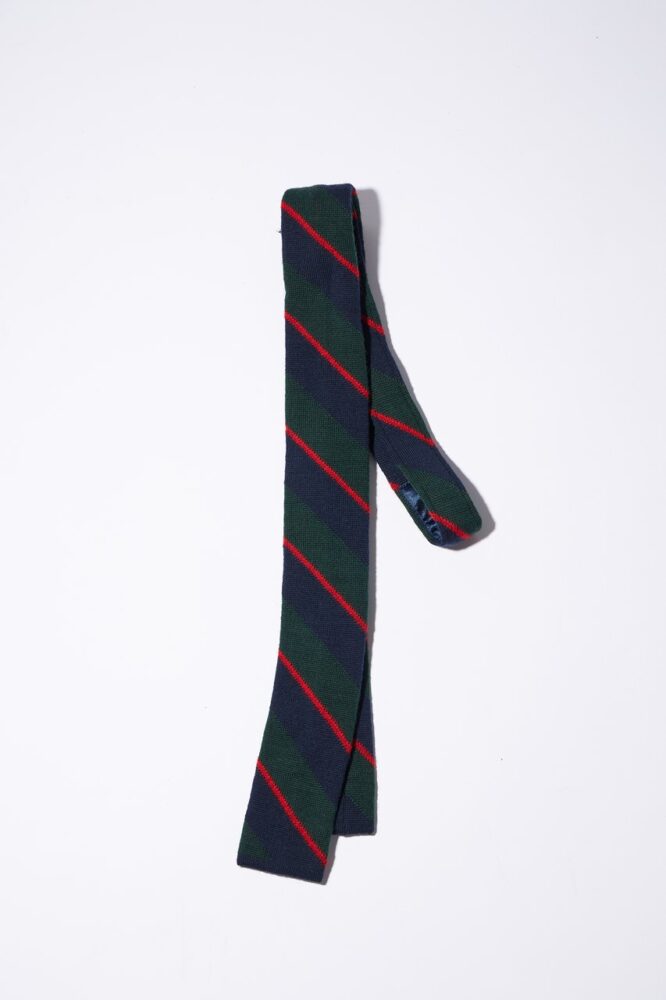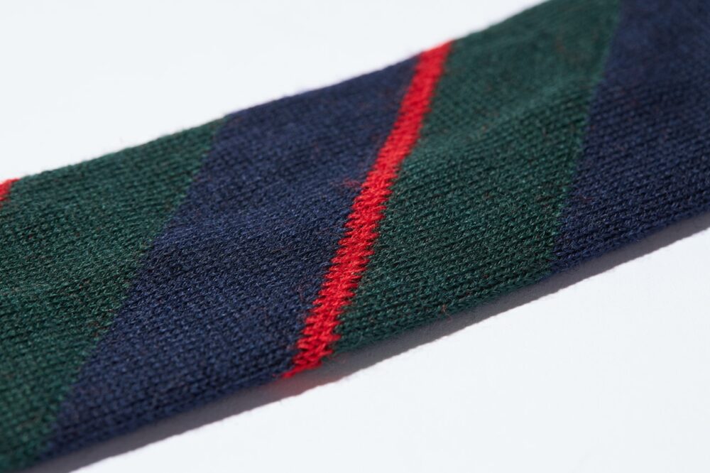 右下がりにストライプが入る「アメリカ式レジメンタル」のデザインをニットタイに落とし込んだ。実はあまりないニットとレジメンタルの組み合わせは、特に休日のトラッドスタイルに合わせることを想定し製作。配色も定番の「グレナルモンドカレッジ」のカラーを採用している。