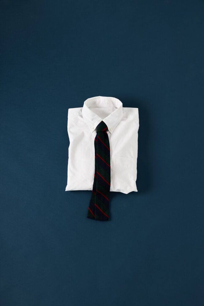 レジメンタル柄だから、紺ブレとの相性は言わずもがな。さらに、アメリカにある「グレナルモンド」という大学の配色を採用したカラーリングには、ネイビーやグリーンが組み込まれているため、デニムやミリタリーパンツとの相性も抜群だ。休日のタイドアップスタイルにおける大活躍を保証する。