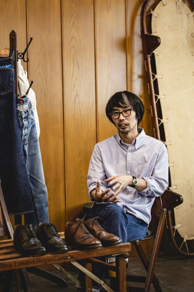 林芳亨(以下、林) ちょくちょく会っていますよね。あれから一年経って、まず思うのは最近は革靴も改めて見直されてきてるなと。それはジーパンと革靴が似てるからじゃないかなと感じています。自分がそうだからかもしれないけど、革靴もジーパンと同じように、直しながら履くものじゃないかな? シワが入った、どうしようとか、変に気を遣って履くんじゃなくて、好きなように履いてお手入れすればいいじゃないかと。それが、その人の靴の顔になると思うんだよね。これってまさにジーパンと同じだけど、革靴はジーパン以上に寿命が長い。だからこそ、そういう履き方でいいと思う。