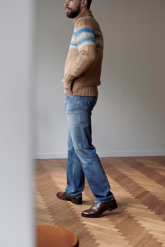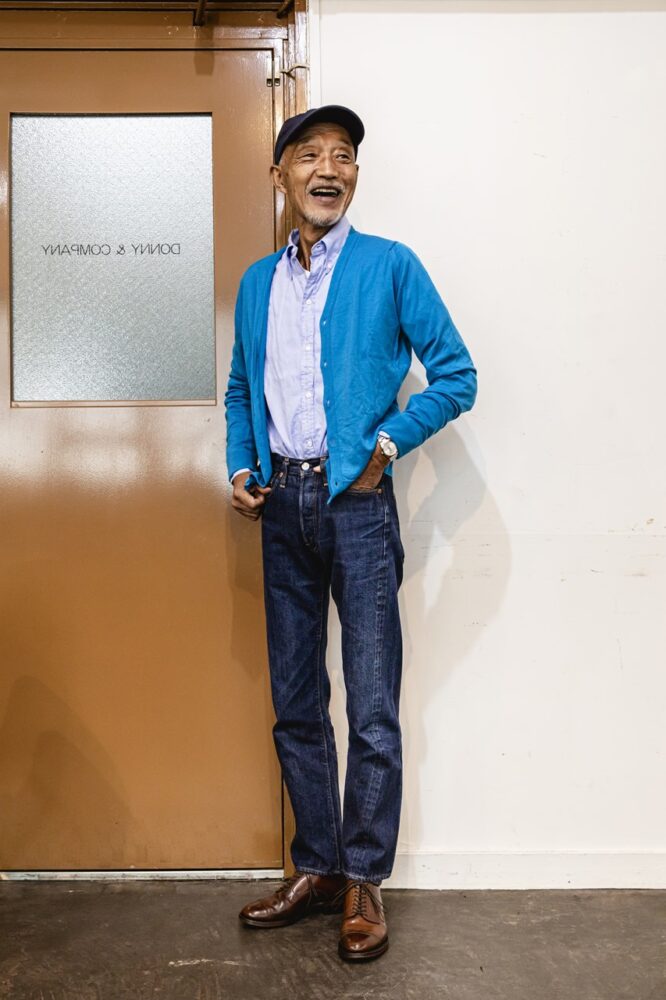 「靴はきれいなチョコレートブラウンなので、それ以外をブルートーンで合わせると、靴も服も引き立つかなと思っています。ジーパンは濃いめの色合いのリゾルト[711]にしました」