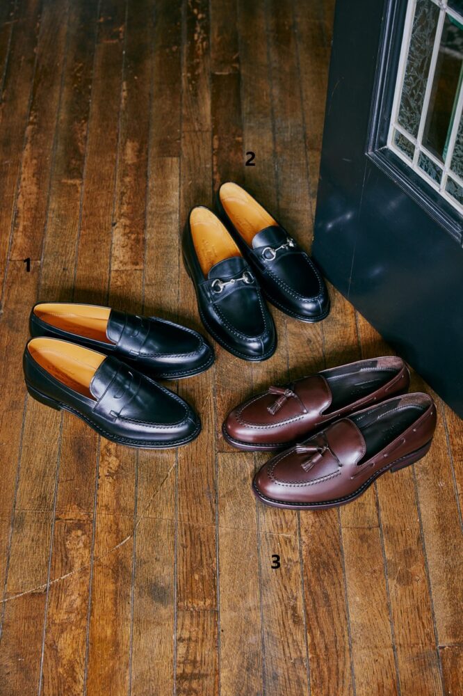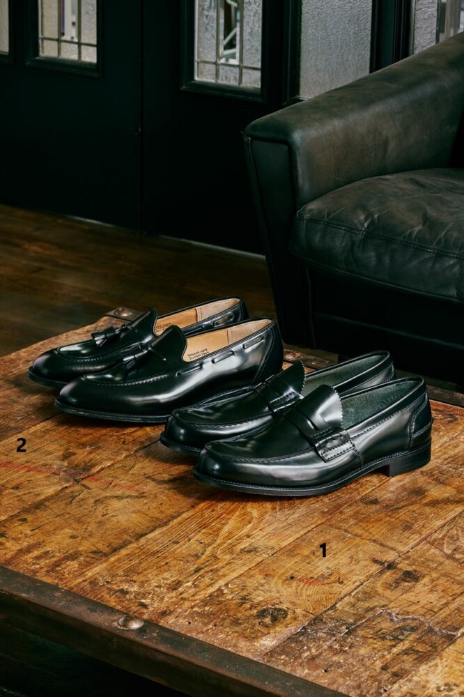 同社が誇るローファーの大定番、[98589] の後継として生まれた新定番。踵の小さい日本人の特徴に合わせたラストの履き味は歩行時にこそ伝わる。その革底には通気性と足馴染みの良さに秀でるイタリア産を起用。3万7400円