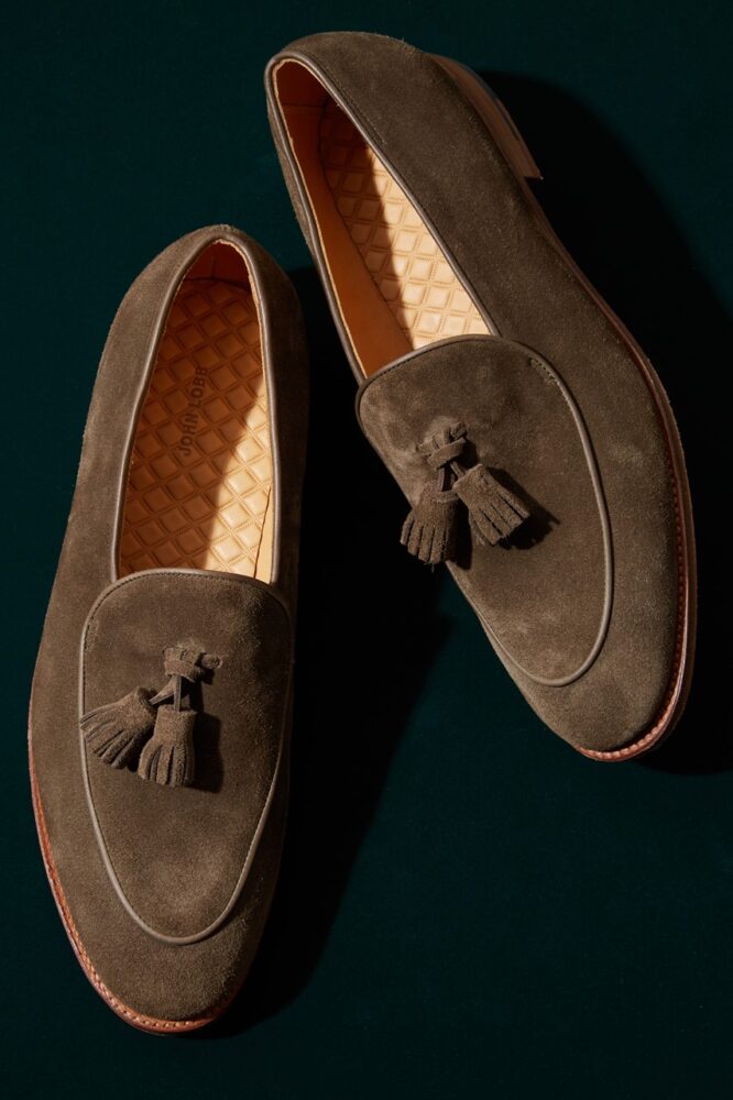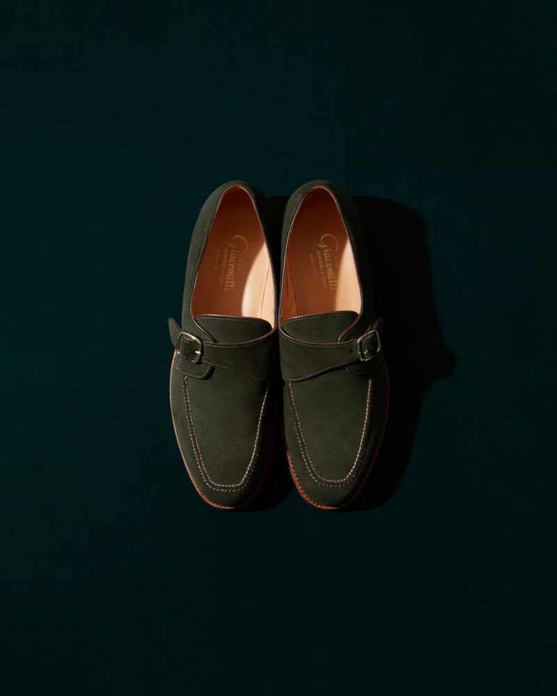 エプロンとトップラインにフレンチ バインディングを施した [エドモンド]。丸みのあるトゥが特徴で、きめが細かく上品なスウェードはオリーブをまとう。24万2000円(ジョン ロブ ジャパンTEL03-6267-6010)