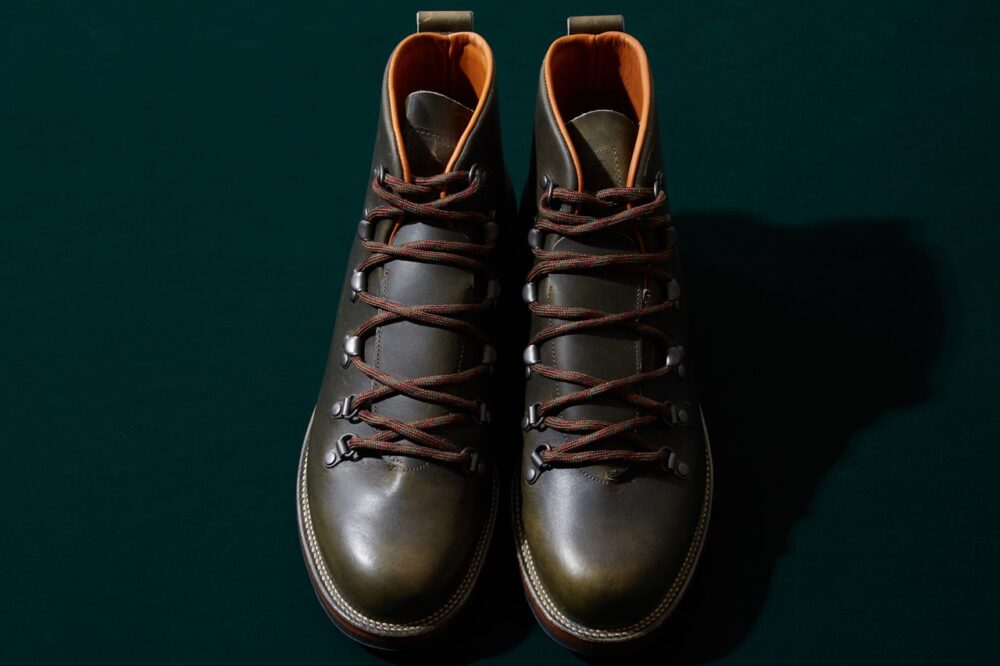 カナダの職人がハンドメイドで作る名門登山靴ブランドのレースアップ仕様で仕立てたマウンテンブーツ。ホーウィンレザーのオリーブカラーがニブい輝きを放つ。16万8000円 (ヴァイバーグ東京ショールーム TEL03-6264-8494)