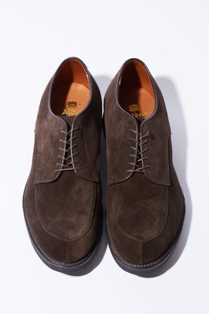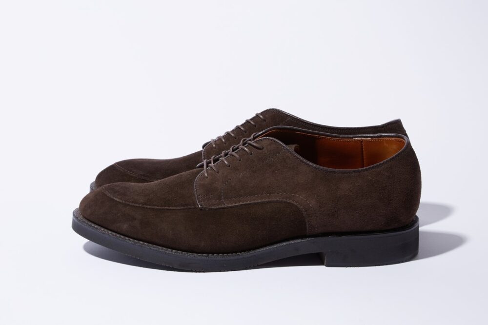 定番のVチップシューズをスウェードでオーダーした別注。グリップ力のあるドレスラバーソール、アイレットをあえて使わない仕様など、ドレッシーな要素を高めているのもポイント。オンオフ問わず使える。 11万6600円(クリスピンTEL076-421-3651)