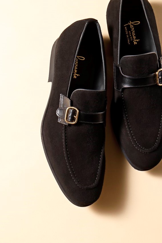 色気を感じるロングノーズでスマートなラストを使ったローファーに、シングルモンクストラップのような意匠を加えた別注モデル。さらにスムースレザーとスウェードのコンビネーションにすることで、より個性的なデザインに。マッケイ製法らしい軽さも魅力のひとつだ。5万8300円