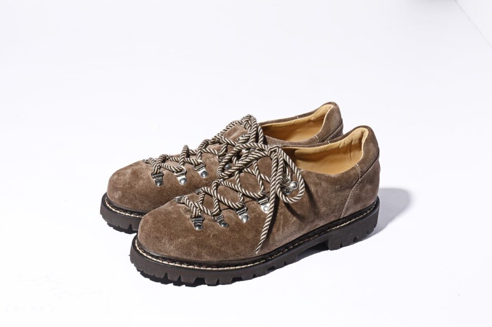 トレンドの兆しがあるトレッキングシューズをドレッシーな仕様に変更。インラインではホーウィンのクロムエクセルレザーであるが、ベルスモーキーのスウェードに変更。アウトドアフィールドから街まで活躍できるスタイルに。8万300円