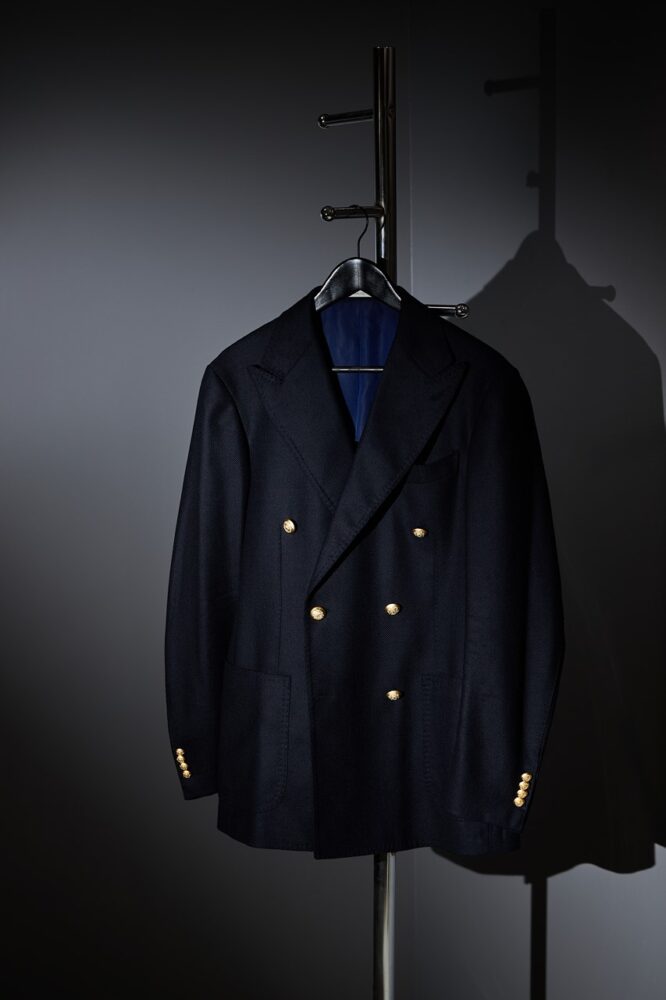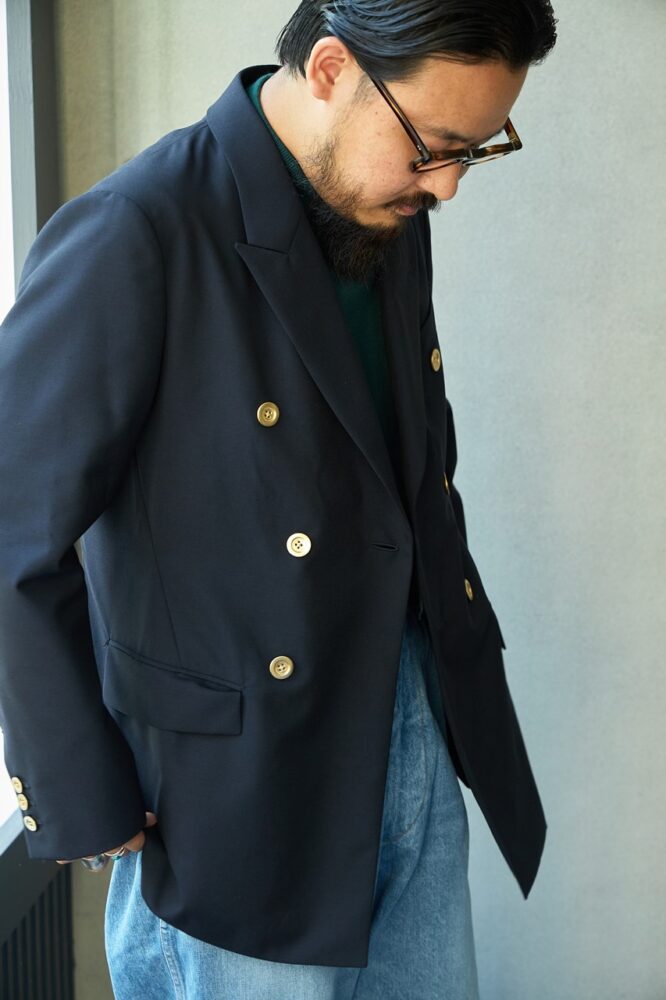 「英国産の原毛100%の張りとコシは非常にラグジュアリーです。ボタンも定番の金ボタンを使うことでオーセンティックなダブルのスタイルを踏襲しつつ、米英ではなくあえてフレンチ感覚を落とし込むことで、ロックTやダメージデニムなどにも合わせられる1着に仕上げています」