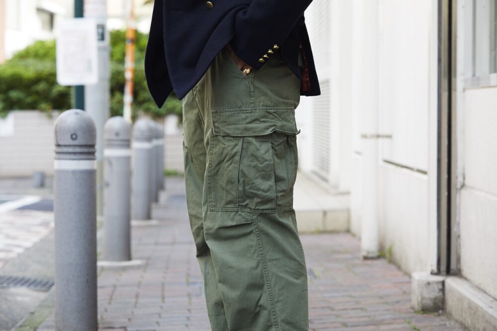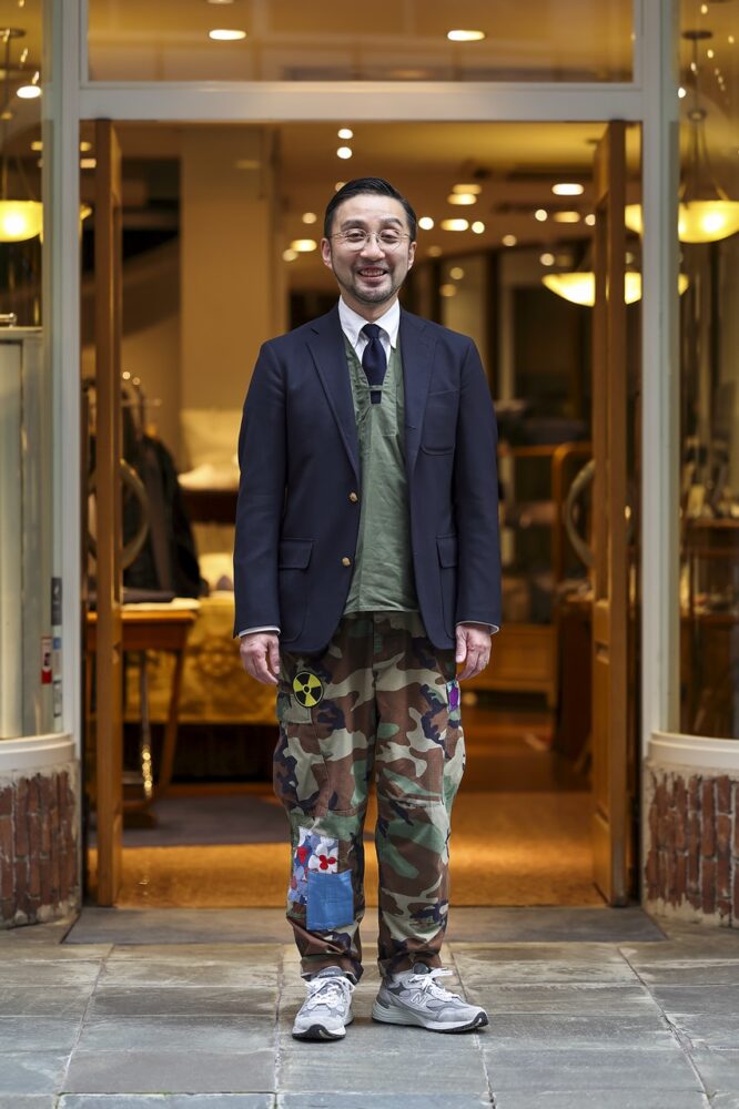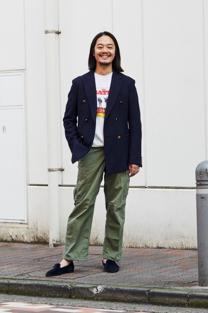 「古着のブレザーは着丈が長いものが多いので、ミリタリーチノやM-65などの軍モノのボトムスと合わせてゆったりとしたシルエットで着用することが多いです。ただし、だらしなく見えないようにタイドアップをしたり、色をある程度まとめる等は必ず意識しています。古着屋らしく、ちょっとした商談の場ではこのスタイルですね」