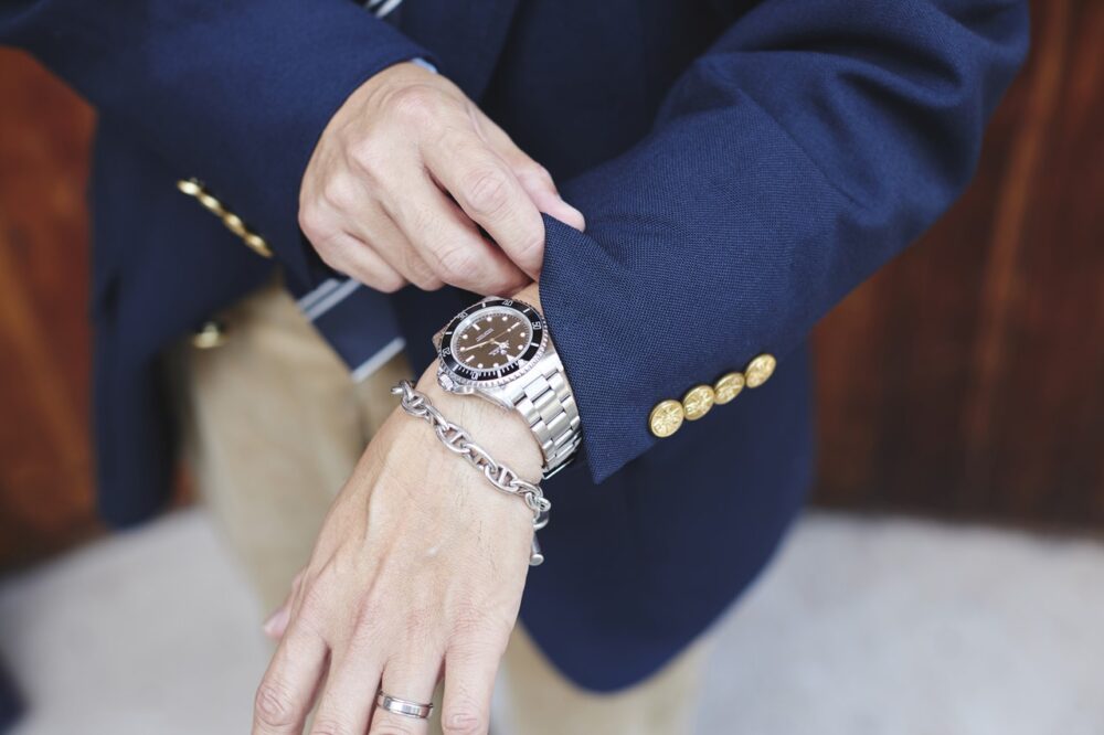シャツ/ポロ ラルフ ローレン、ネクタイ/ Unknown、パンツ/ナイジェルケーボン、ベルト/ Unknown、シューズ/オールデン、バッグ/ L.L. ビーン、時計/ロレックス、ブレスレット/エルメス(以上すべて本人私物)