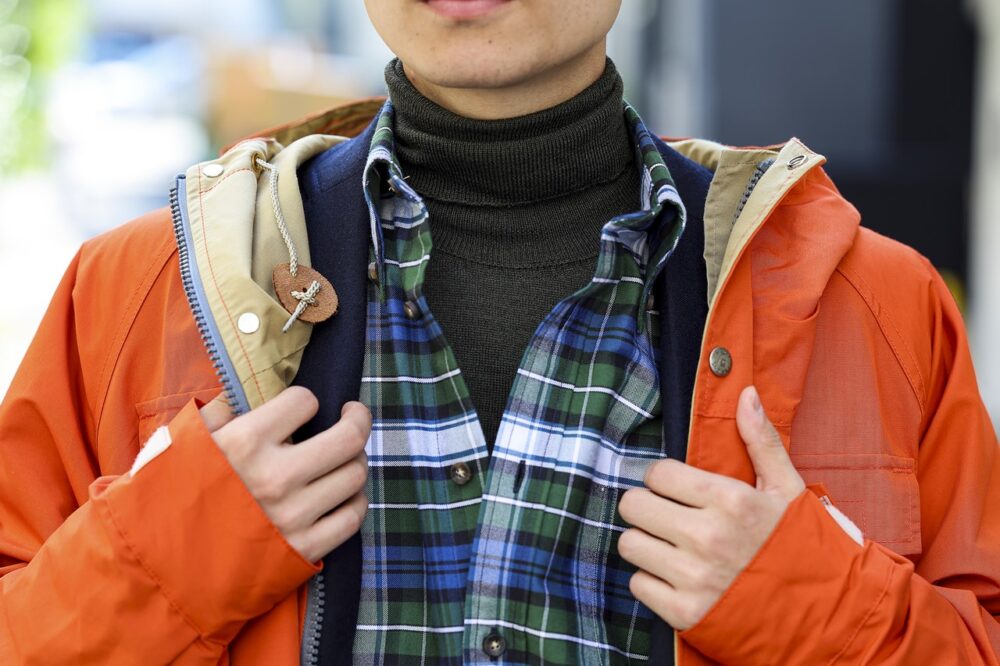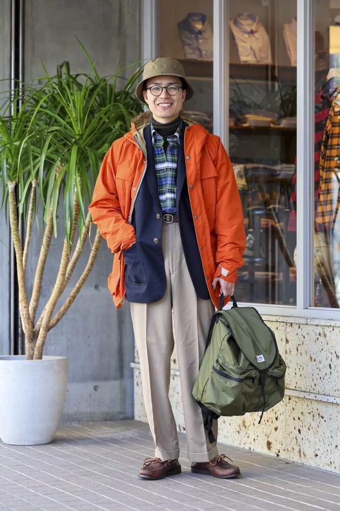「70〜80年代のバックパッカーブームを意識した、オレンジ×グリーンの配色もこだわりのひとつ。そのアクセントカラーとして、金ボタンの紺ブレを差し込みました」。マウンパを脱げば、ブレザーが主役のクラシックなアメカジコーデに。 「このブレザーは、自分的にはトラッドよりもカジュアルに着こなしたいアイテムですね」