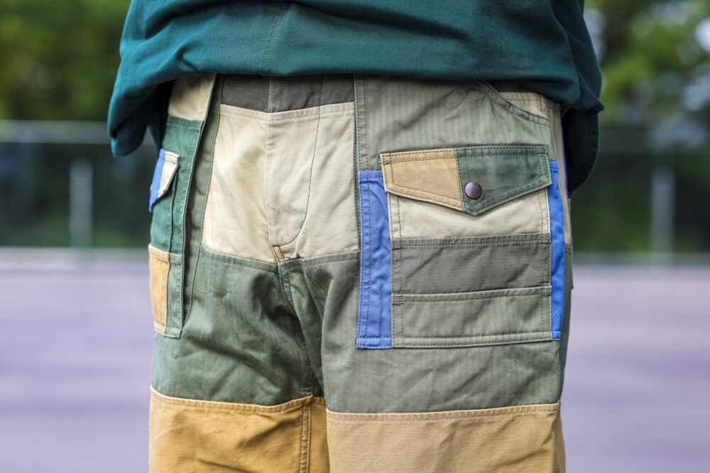 「このジャケットは、アメリカのワークウエアやユニフォームに採用される生地で作られているので、その雰囲気や質感が活きるように、全体的にヘビーデューティなアイテムでまとめてみました 」。
