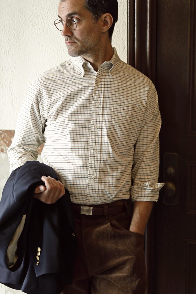今の時代にあったシルエットということで身幅を緩やかに設定したオリジナルのBDシャツ。肩周りや首周りのサイジングで全体のバランスを取っており、ルーズになりすぎず、しっかりクラシカルな雰囲気も備えている。2万2000円(S&O コネクトTEL03-6447-5095)