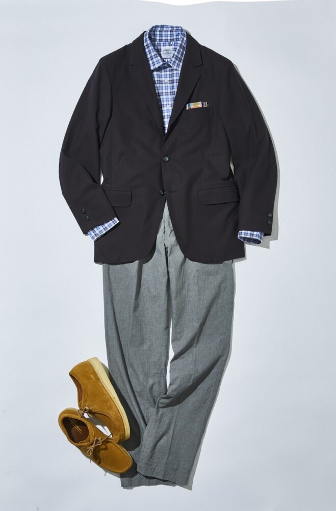 デザインソースは、1930年代に米国の権威ある老舗ショップが作っていたスーツ。肩のラインやラペルロールを現代的にアレンジし、コットンギャバ生地によりシーズン問わない。3万7400円