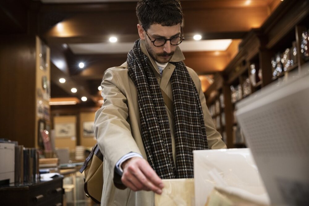 本特集のスタートを飾るのは「ジェントルマンのワードローブ」企画。英国ファッションに造詣が深く、たくさんのコレクションをお持ちのイラストレーター/ソリマチアキラさんに私物をご紹介いただいた。「Aquascutum(アクアスキュータム)」「GRENFELL(グレンフェル)」のコートや、「Cordings(コーディングス)」のパンツ、「John Smedley(ジョン スメドレー)」のニットに「Oliver Goldsmith(オリバーゴールドスミス)」のメガネなどなど……。私物紹介ではありながら、英国のクラシカルな名品をひととおり網羅することができる企画となっている。また、ソリマチさんは単にTPOだけでなく、「どんなお店に行くか」「そのお店はどんな雰囲気か」によって、その日のスタイリングを考えるそう。そこで、彼の行きつけの場所と、その場所に行くときどんな格好をするのか。実際に現地に足を運んで、ソリマチさんお気に入りの素敵なスタイリングをご披露いただいた。また、同企画には圧倒的人気を誇るデニムブランド「RESOULTE(リゾルト)」の林芳亨(はやし・よしゆき)さんもお招きしている。