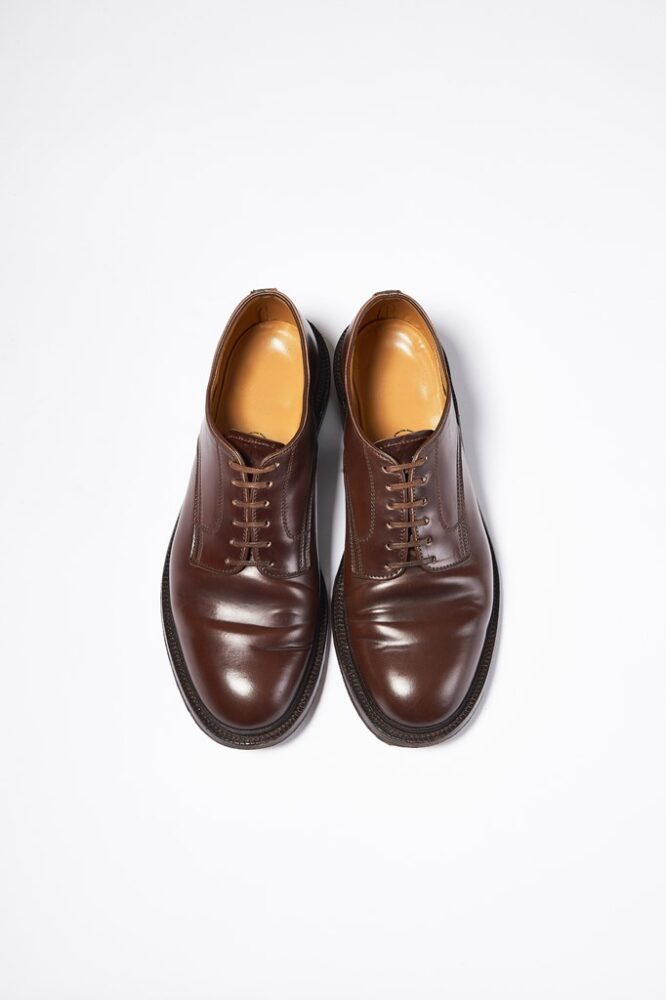アッパーを横切るように深く入った貫禄ある横ジワが大迫力。シワの入り方は、実はメイカーズがサービスシューズらしいエイジングを想定して選んだ木型によるもの。デザイナーの手嶋氏によれば、アメリカ式のややひねりのある木型を選ぶことでワイルドな横ジワが入るようで「予想通りですね」との回答。おかげで単なるプレーントゥではなく、サービスシューズらしい面構えとなった。