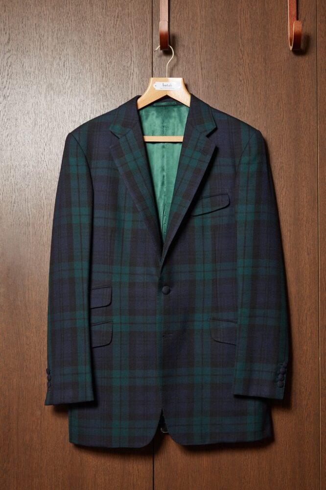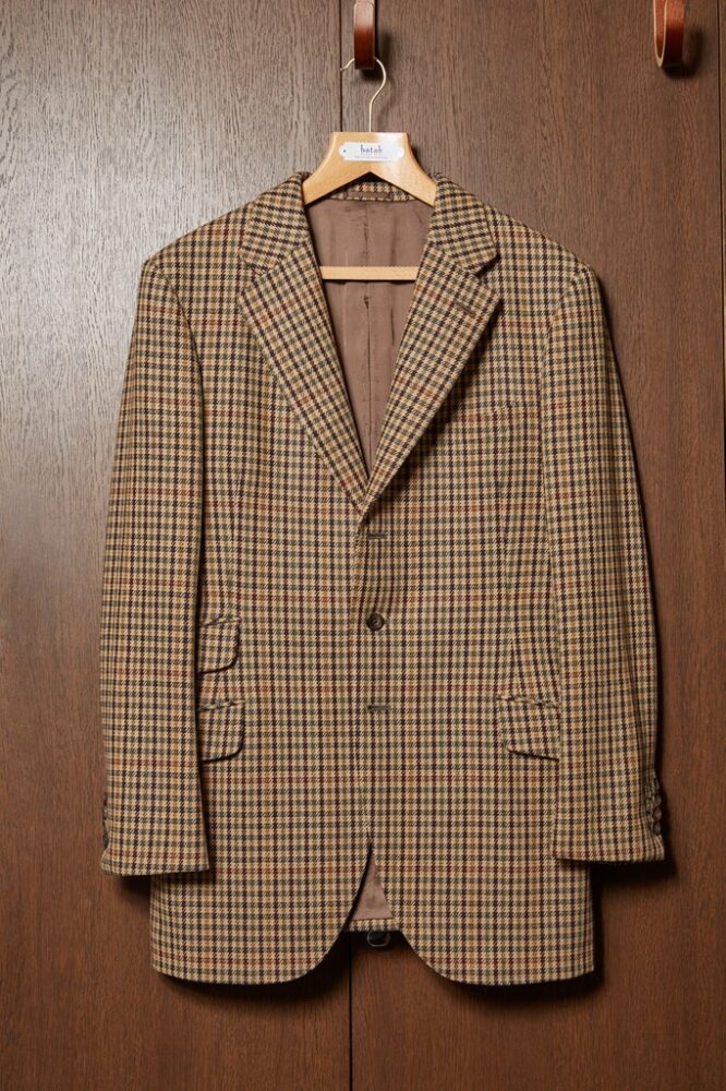 30年代のハンティング系スポーツコートをイメージして製作。スポーティな動きやすいつくりながら、芯地を固くしたりヘビーなサキソニーの生地を採用したりと重厚感も漂う仕上がりに。