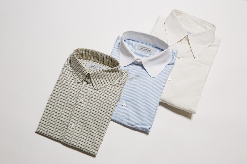シャツもバタクでオーダー。左からタブカラー、ラウンドカラー、レギュラーカラー。フィット感はインナーとしてジャケットの邪魔にならない程度に、ほどよくゆったりとしたサイズ感で統一。