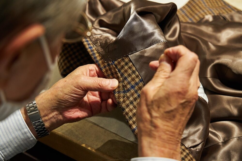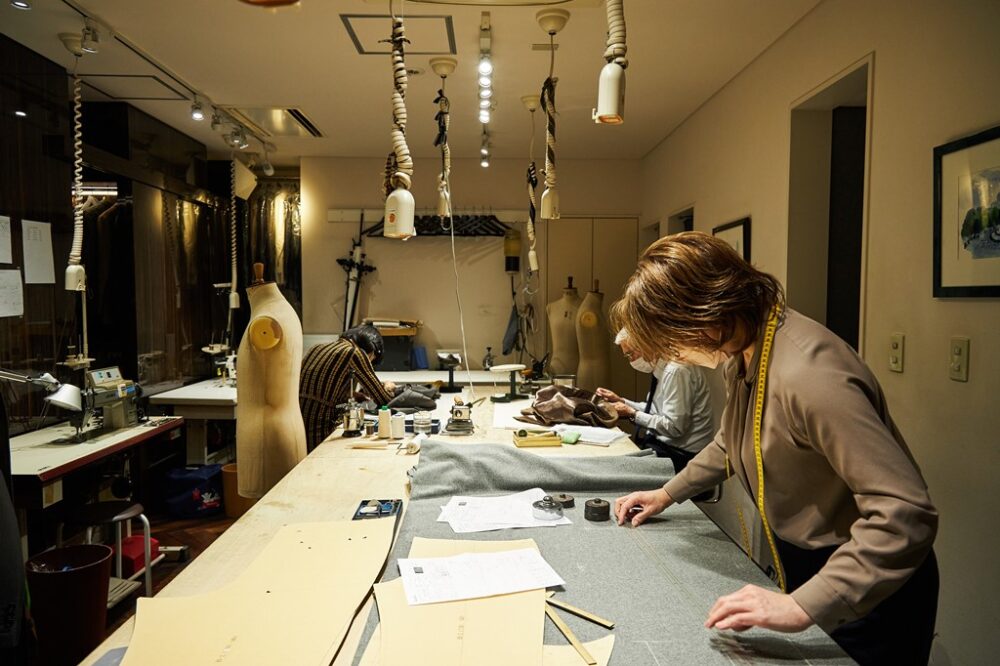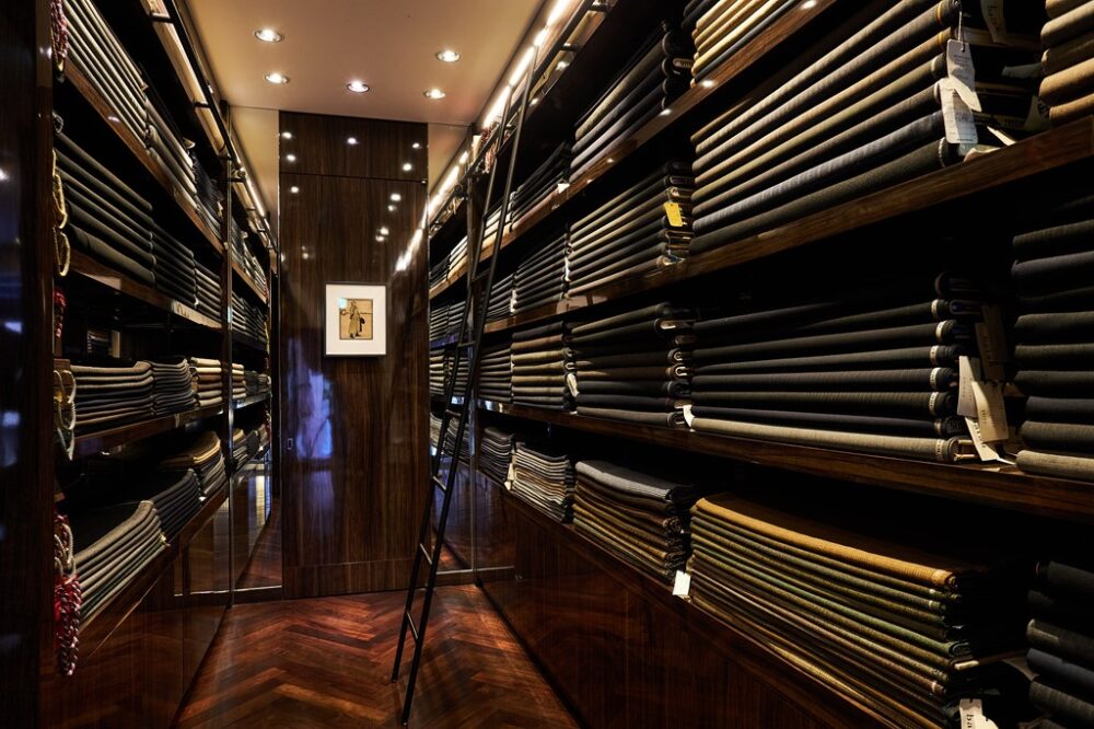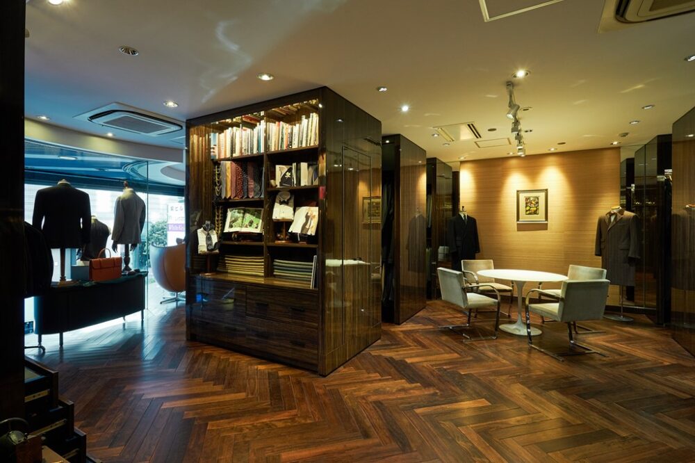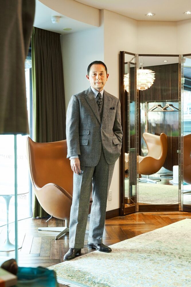 サヴィル・ロウで修業を積んだ職人たちが手縫いをしている作業場もチラリと覗き見え、重厚な空気感に緊張を覚えながらもオーナーの中寺さんに話を伺う。