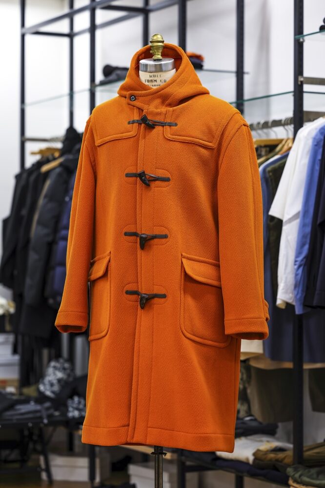 銀座店45周年を記念し、初となるインバーティアに別注を施したオレンジのダッフルコート。1990年代にあったゆったりとしたシルエットを完全復刻させたモデル。インラインのオレンジよりもやや明るめに色から別注を施している。18万4800円