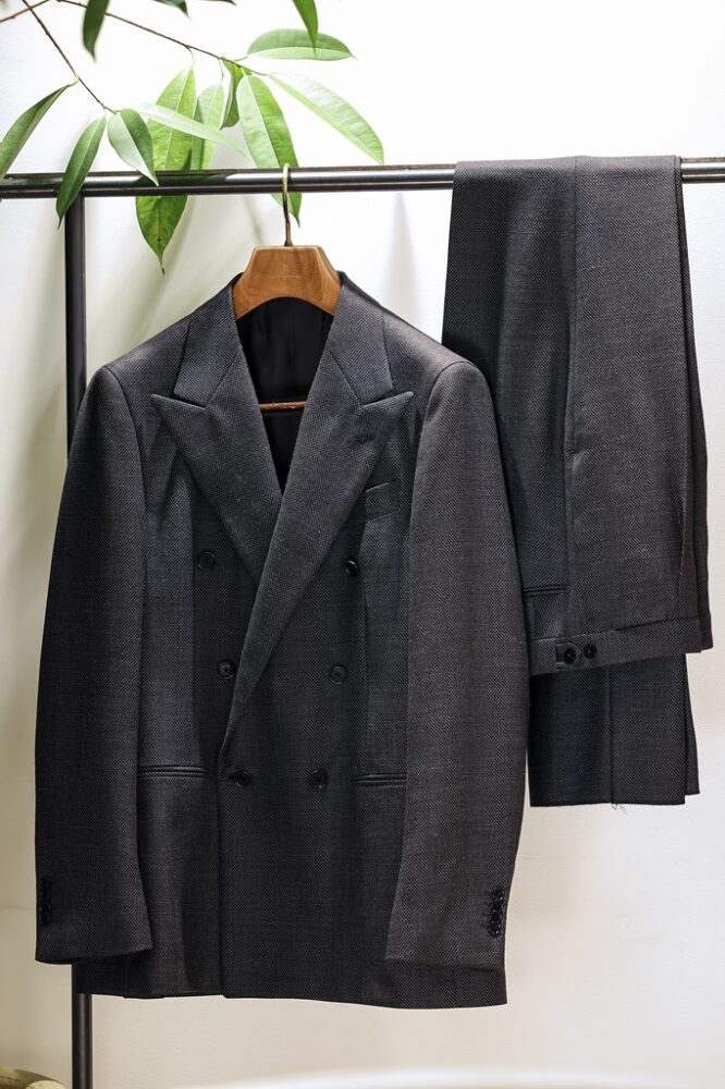 スコットランドの名門であるラバット社のツイード生地を使ったスーツ。ダブルブレストでピークドラペルというクラシックなディテールを使いながらも、ナチュラルショルダーでモダンなシルエットに仕上げているのがお見事である。11万5500円