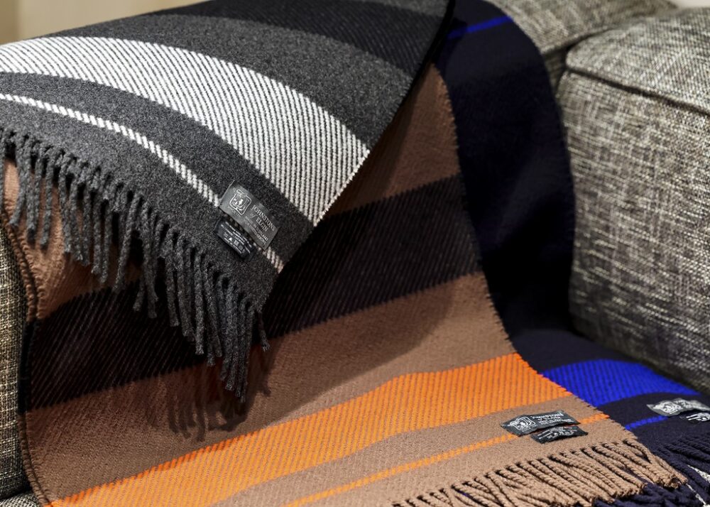英国の名門に別注したストールは、イギリスらしいホースブランケットがモチーフとなったデザイン。グレード の高いメリノウールとカシミヤを混紡することで、暖かさと肌触りの良さを追求したのも◎。各3万7400円