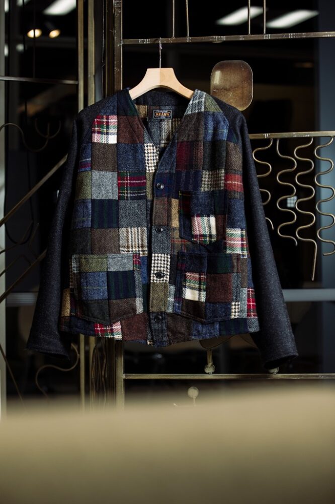 「今シーズンのアイテムの中でも渾身の出来です」と太鼓判を押すジャケットは、英国のムーンの35種類の生地をパッチワークしたもの。トラディショナルな生地を使いながらも、遊び心のある仕上がりである。7万4800円