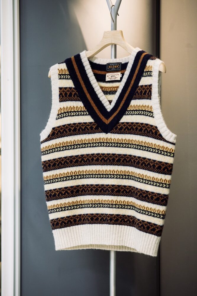 クリケットベストをベースに、スコットランドを象徴するフェアアイルパターンを落とし込んだオリジナル。どうしてもクラシックになりがちなフェアアイルベストだが、うまくスポーティにアウトプットしているのがビームス プラスらしい。1万7600円